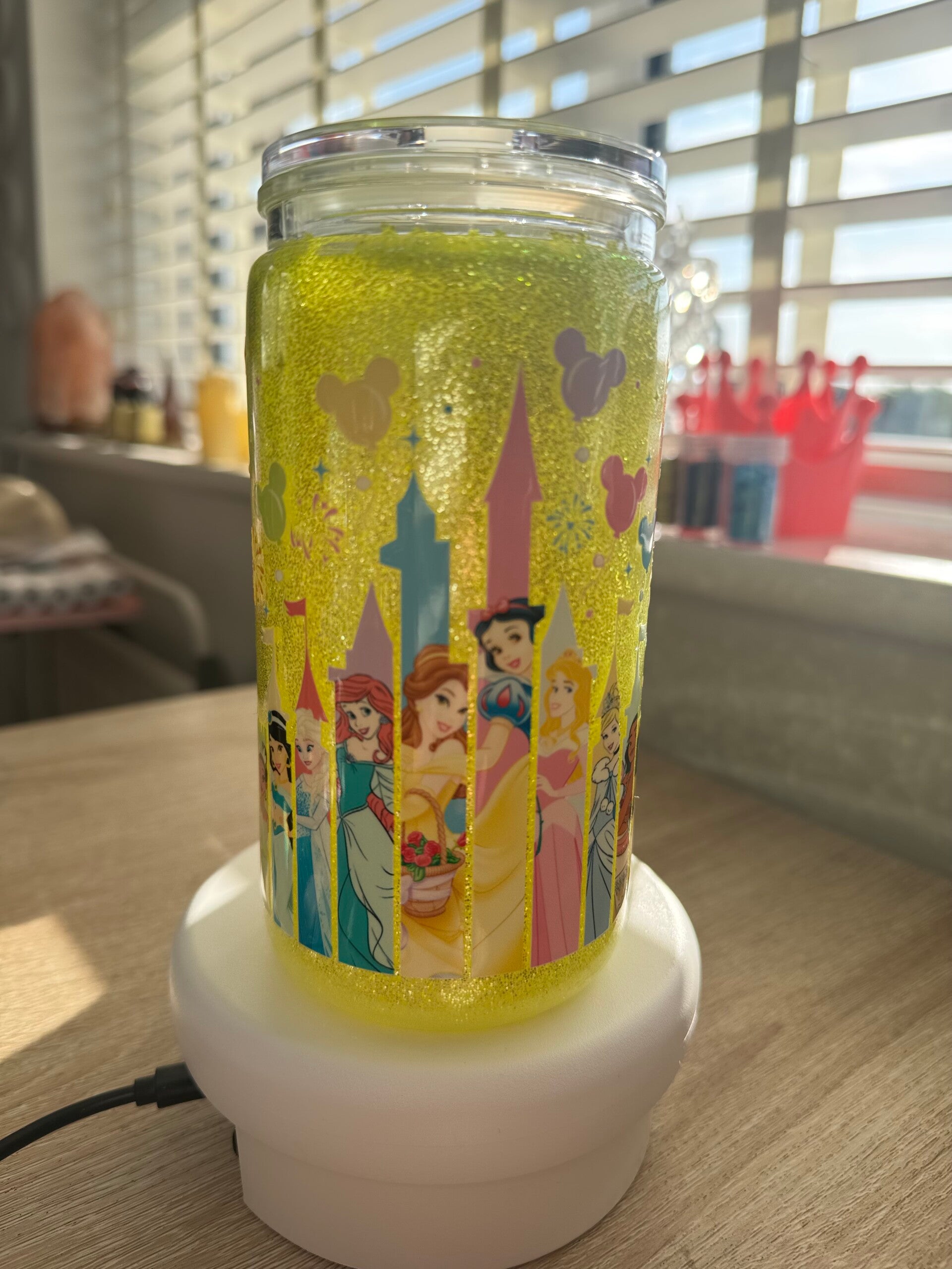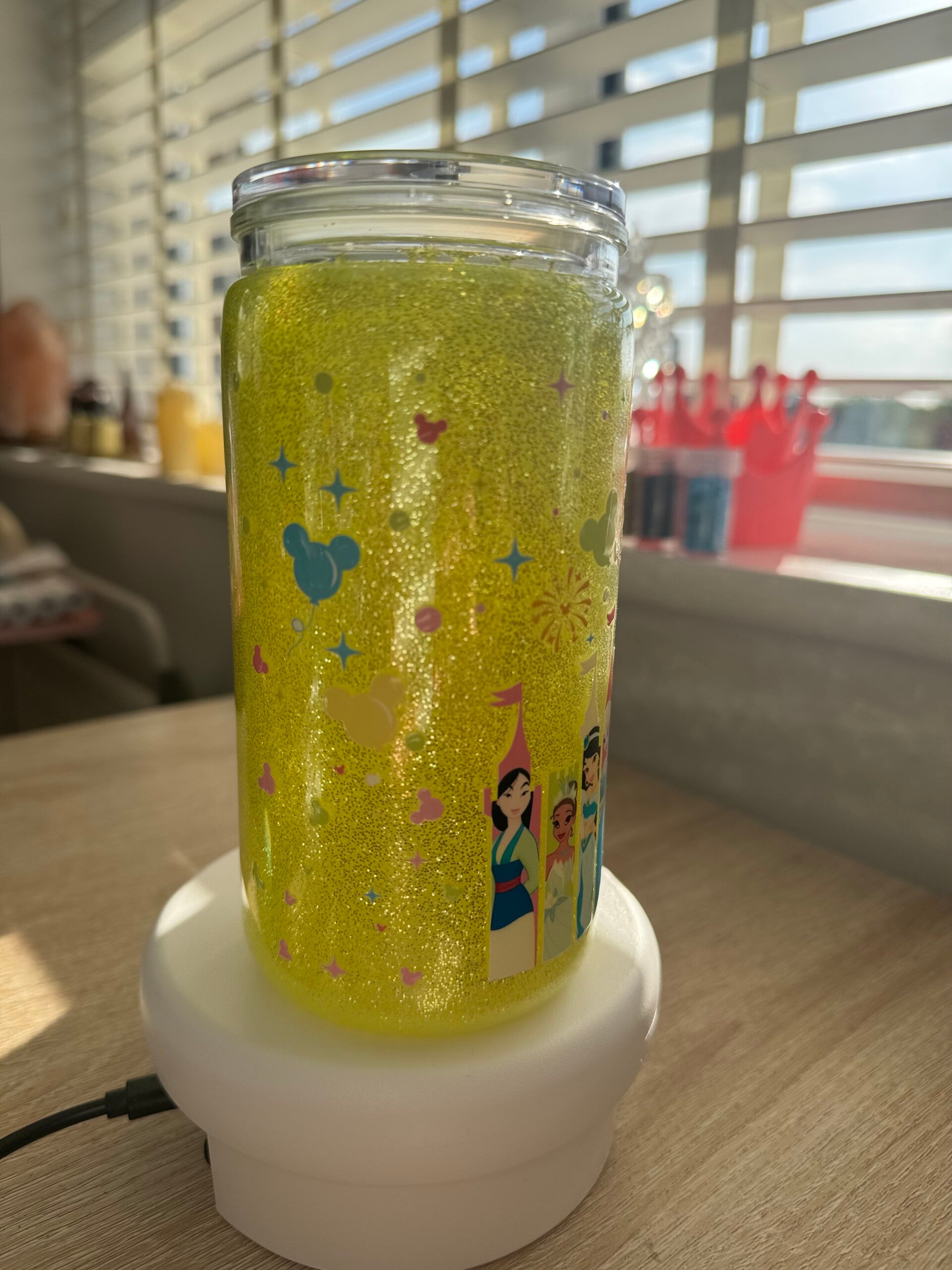 This cute Disney Princess 16 oz acrylic tumbler is the perfect choice for those who are always on the go. This tumbler is designed to be lightweight and durable, making it easy to carry around wherever you go. The vibrant glitter colour makes the princess characters pop.