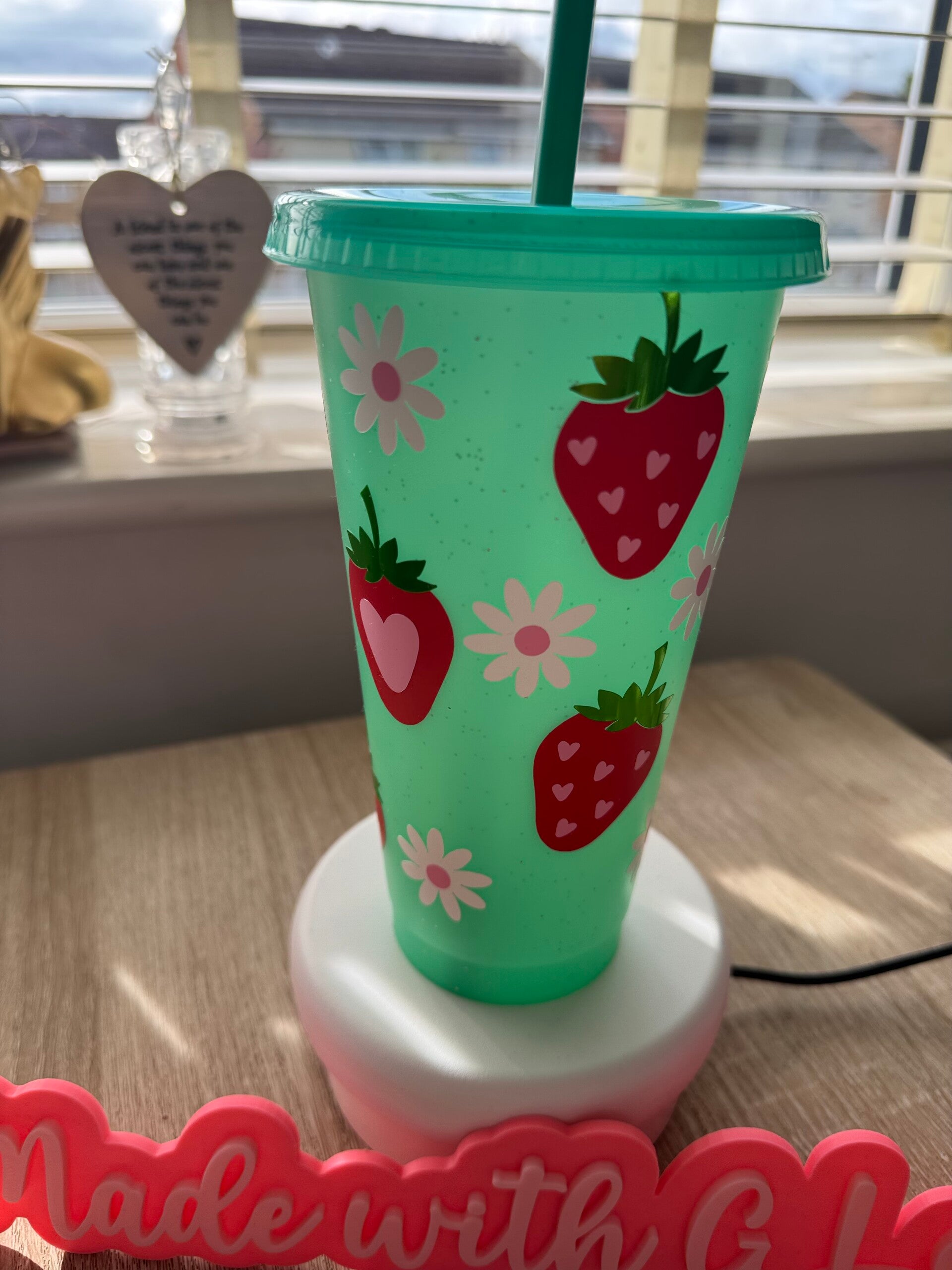 Sip in style with this adorable Strawberry Hearts Tumbler! This charming green cup features cute strawberry and flower designs, perfect for adding a touch of sweetness to your daily hydration. Made from durable plastic, it comes with a secure lid and reusable straw—ideal for smoothies, your favorite cold drink or a cheeky bevvy on the go.