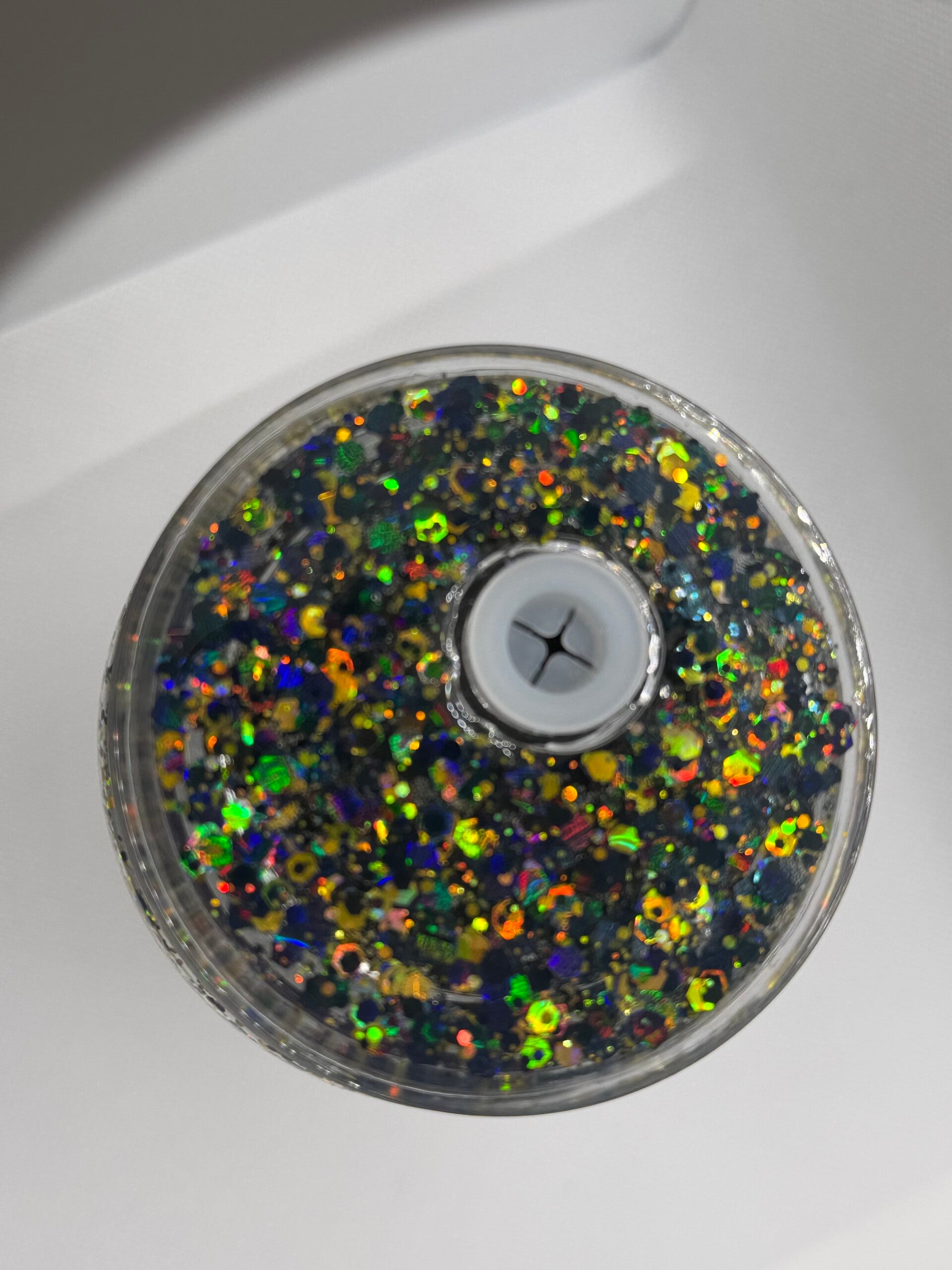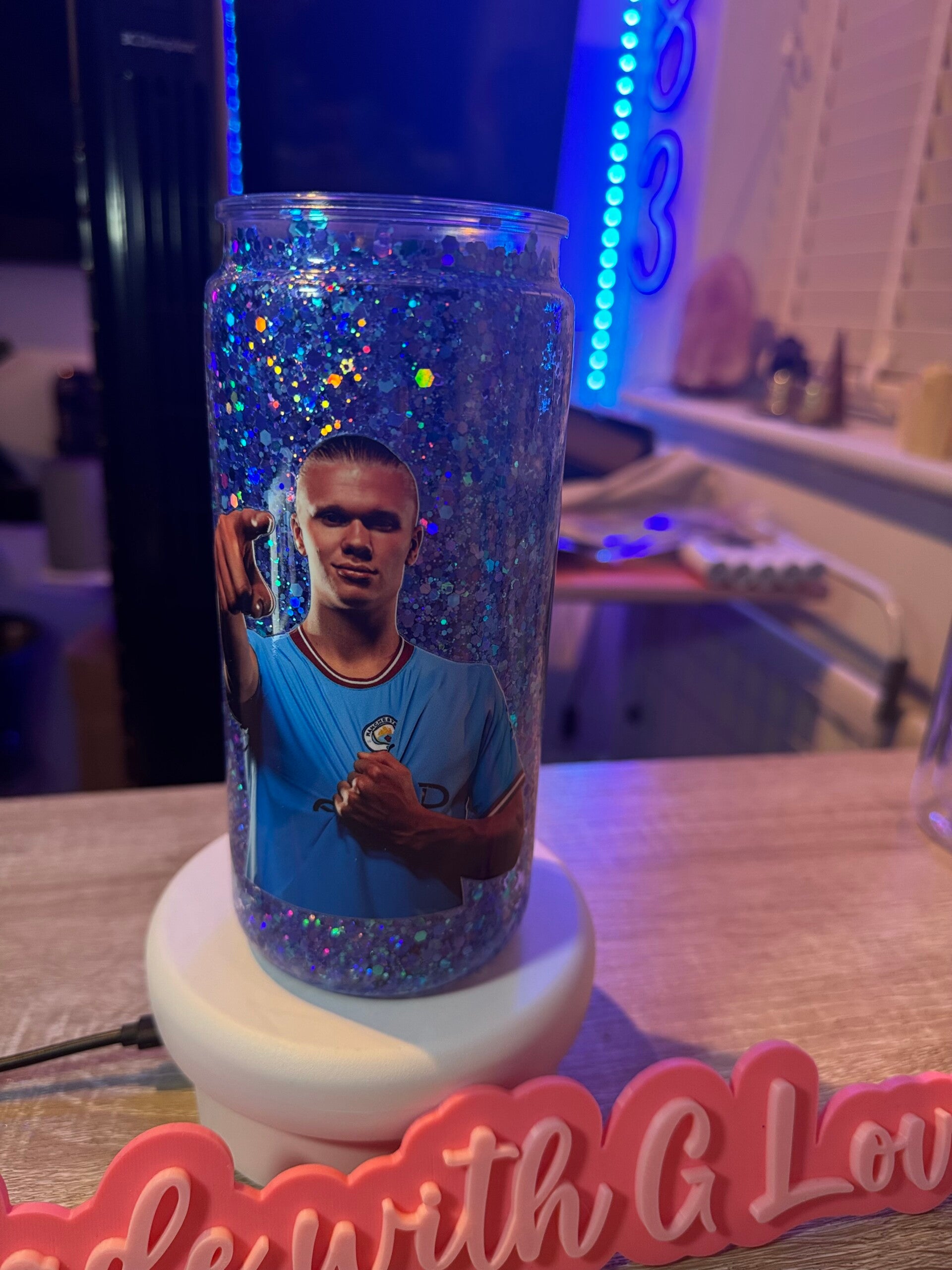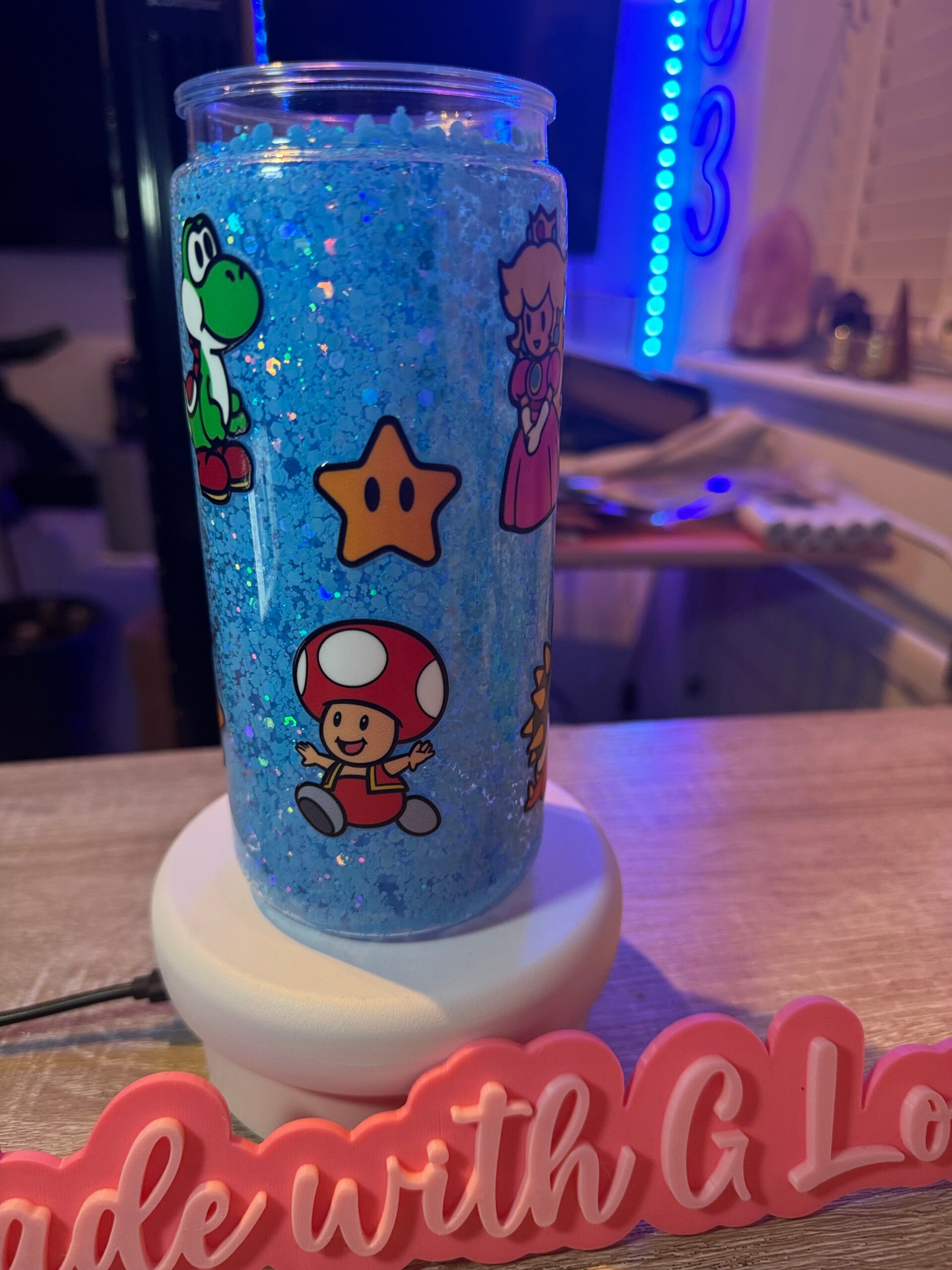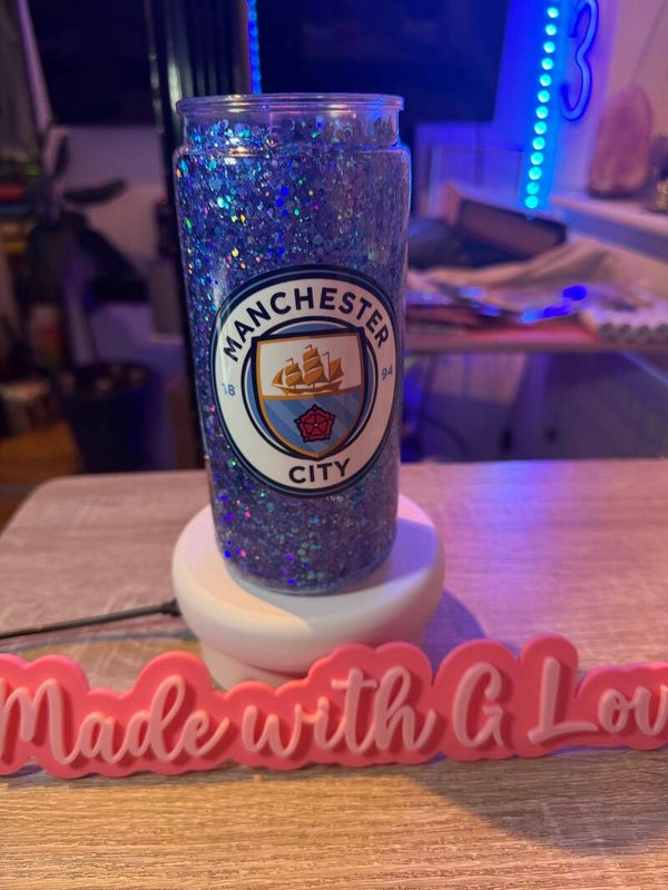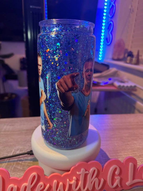 You get to choose your glitters and design, truly making it unique just for you. The tumbler is 16oz, acrylic material and comes with a lid and straw.