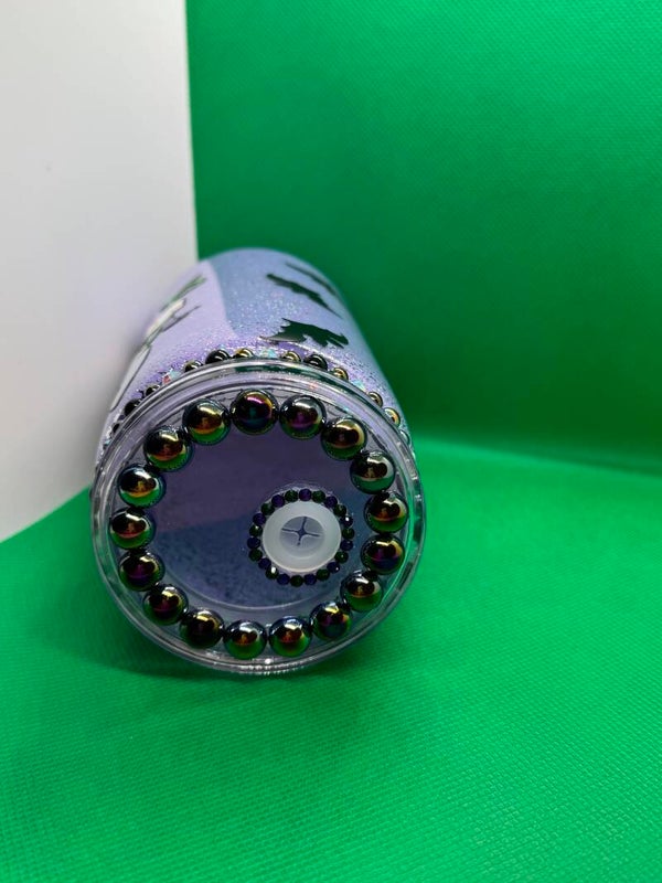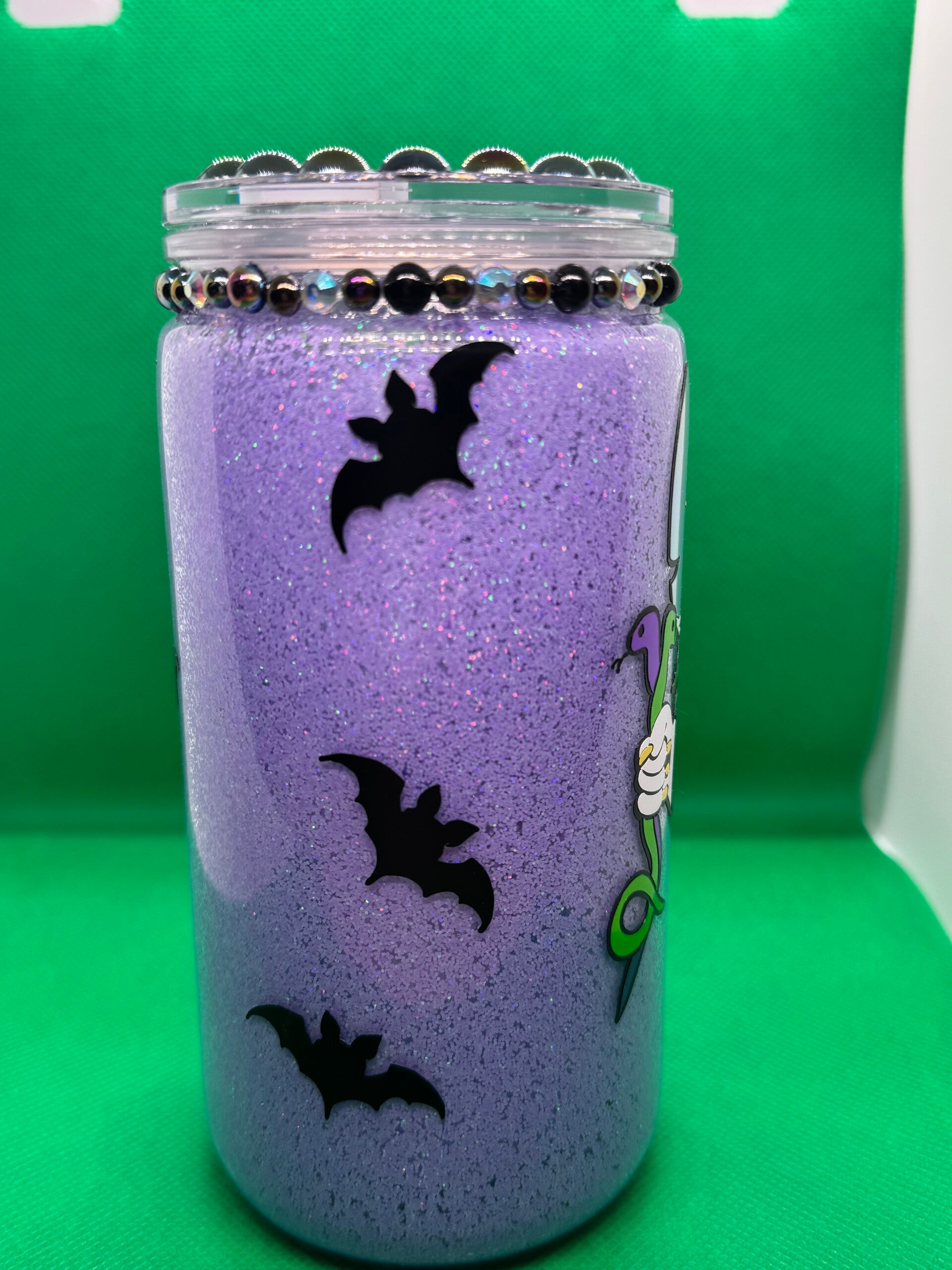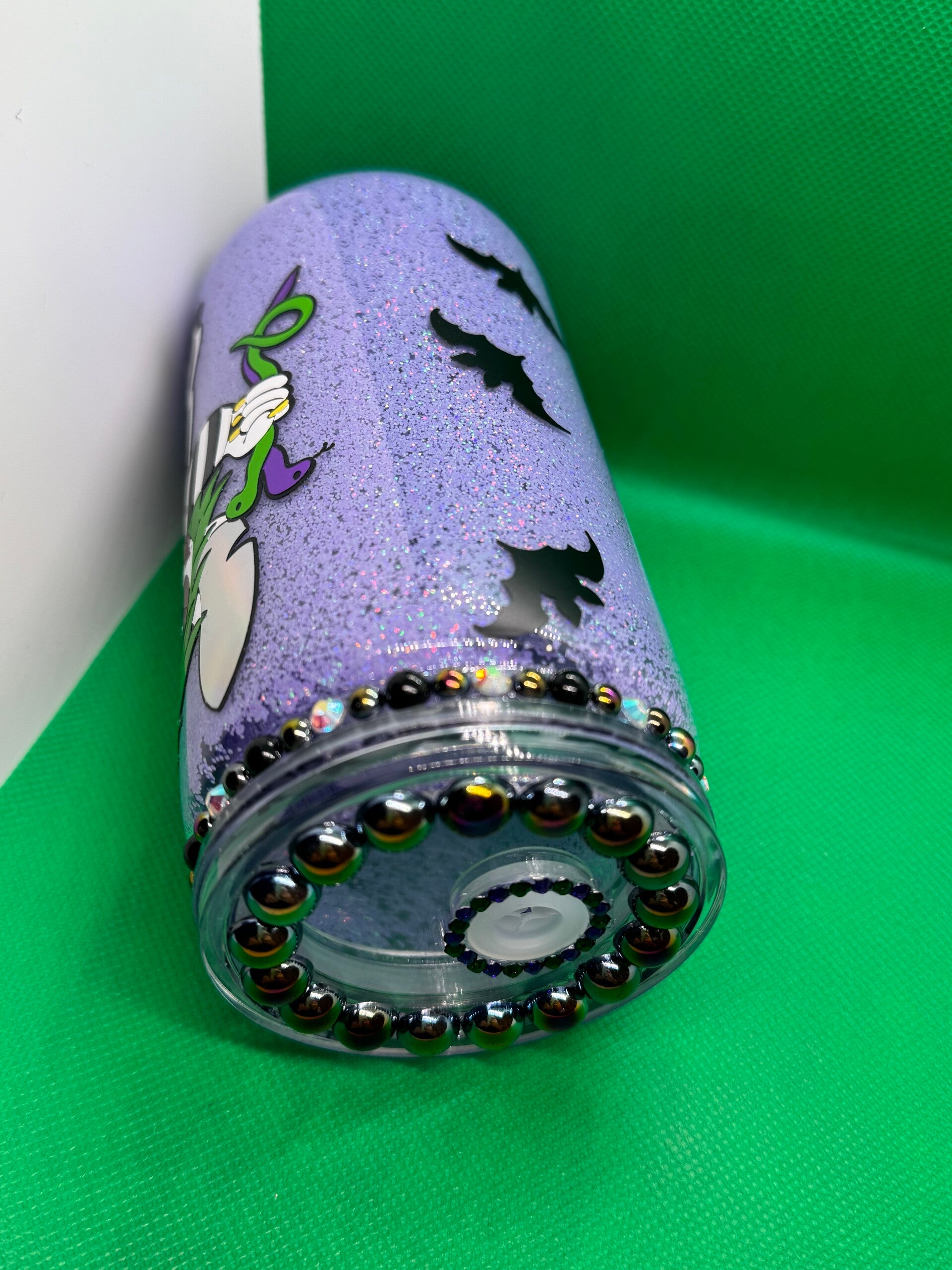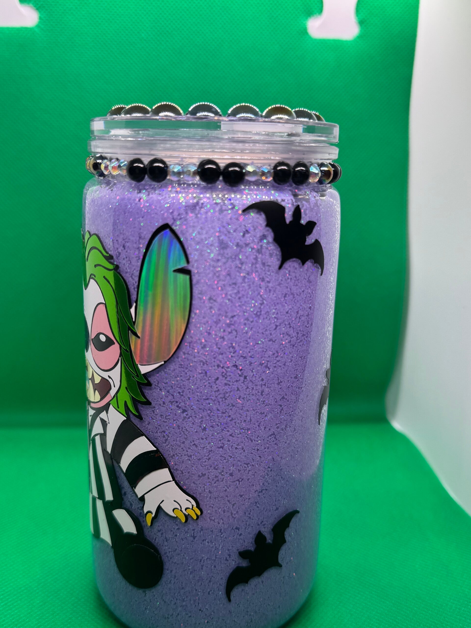Stitch Beetlejuice glitter tumbler with rhinestone and pearl detail
