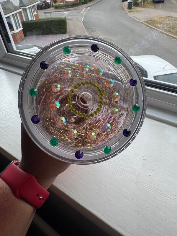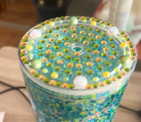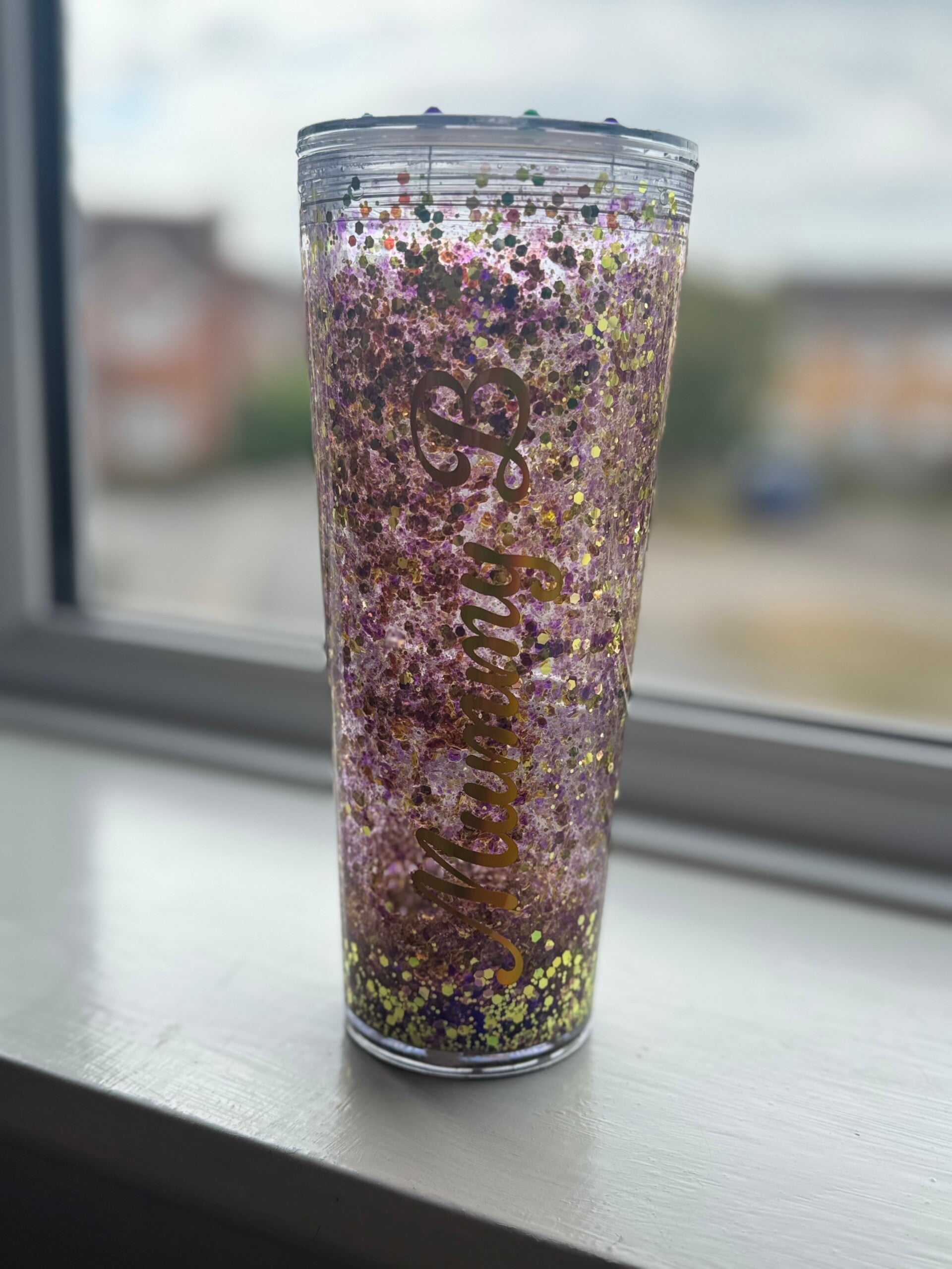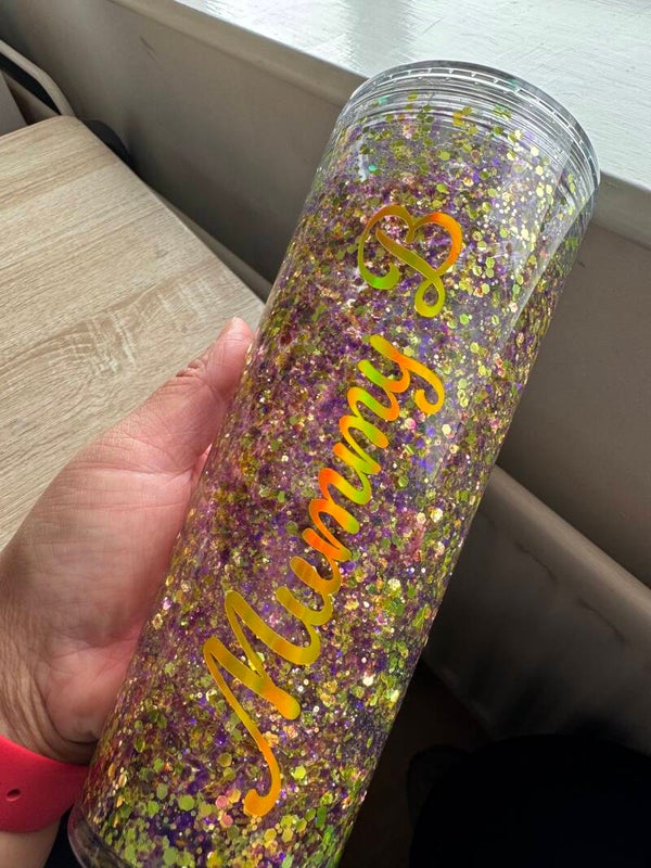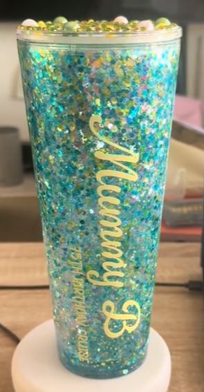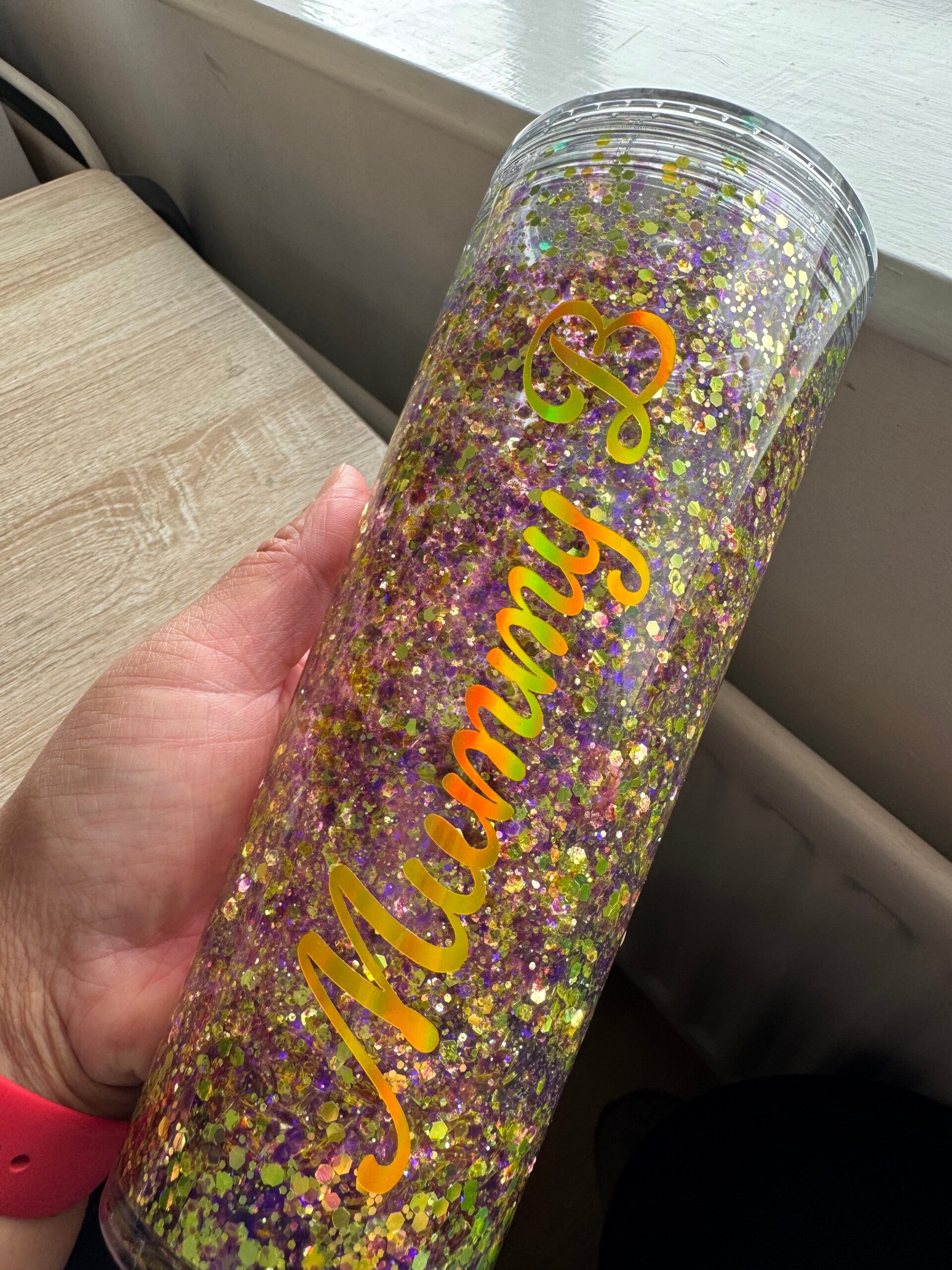 You get to choose your glitters and design, truly making it unique just for you. The tumbler is 24oz, acrylic material and comes with a lid and straw.
