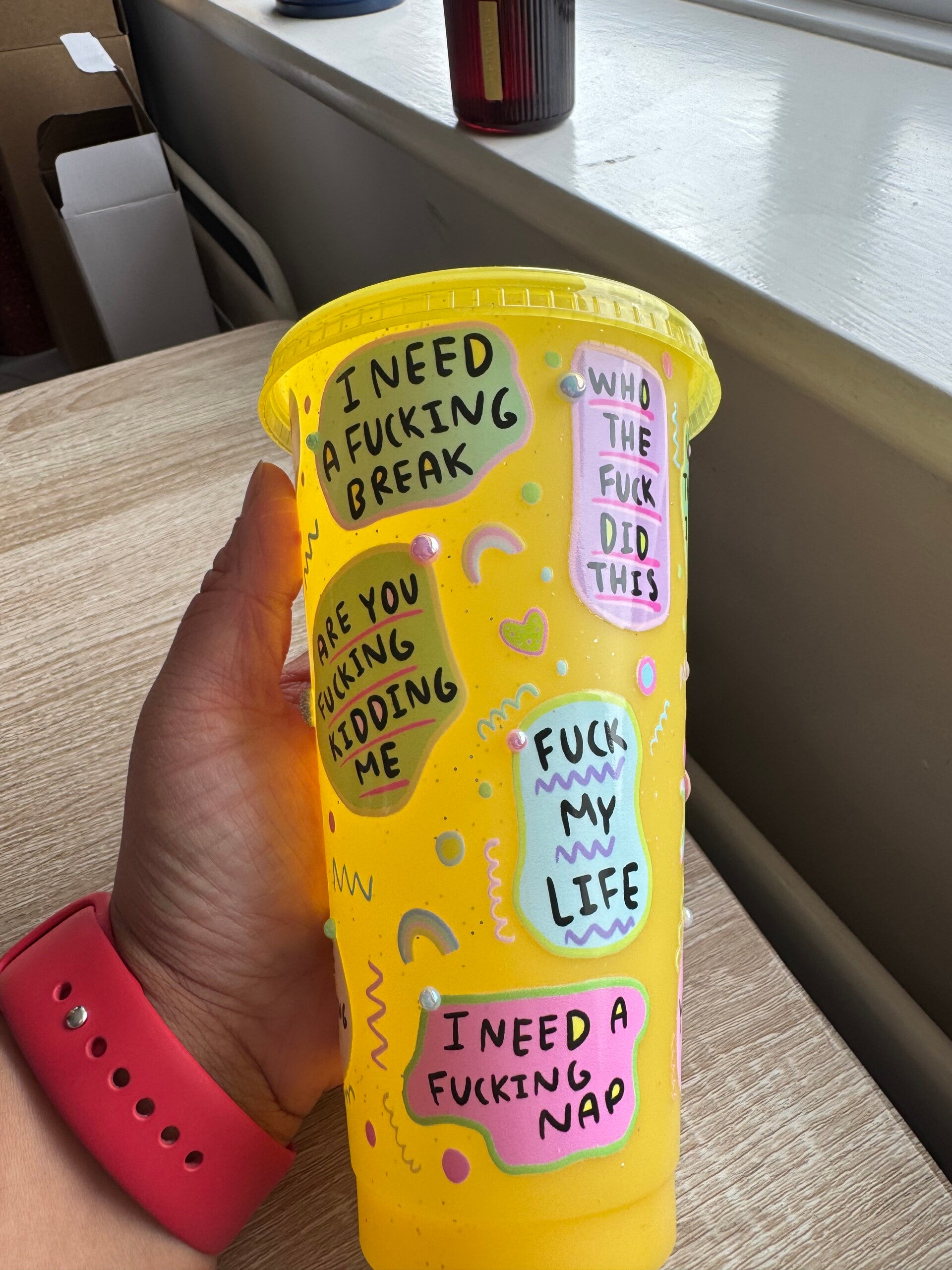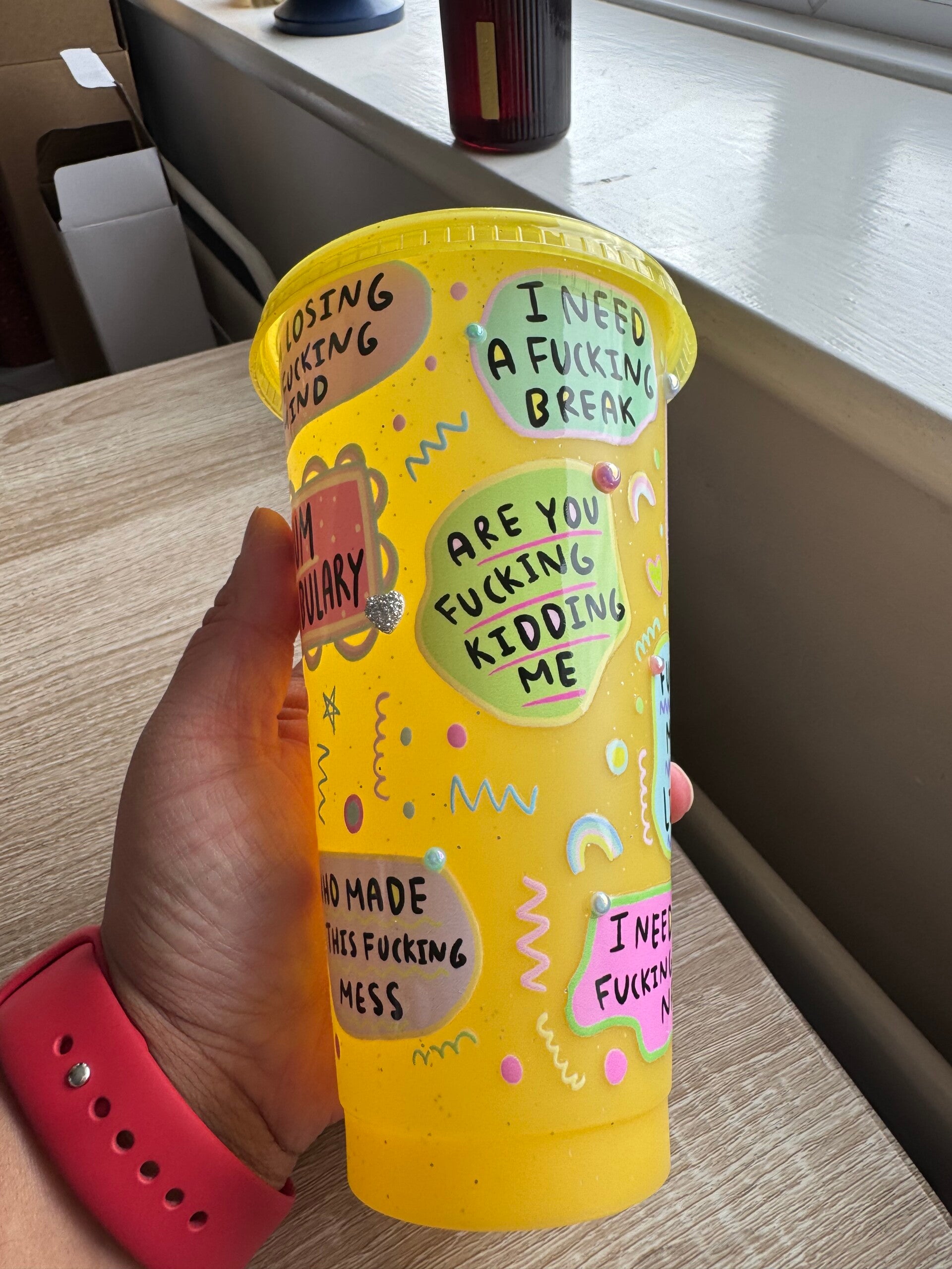 Sip in style with this perfectly worded Mum Vocabulary cup! This charming cup features funny mum sayings, perfect for adding a touch of humour to your daily hydration. Made from durable plastic, it comes with a secure lid and reusable straw—ideal for smoothies, your favorite cold drink or a cheeky bevvy on the go. Look the part with the bling detail.