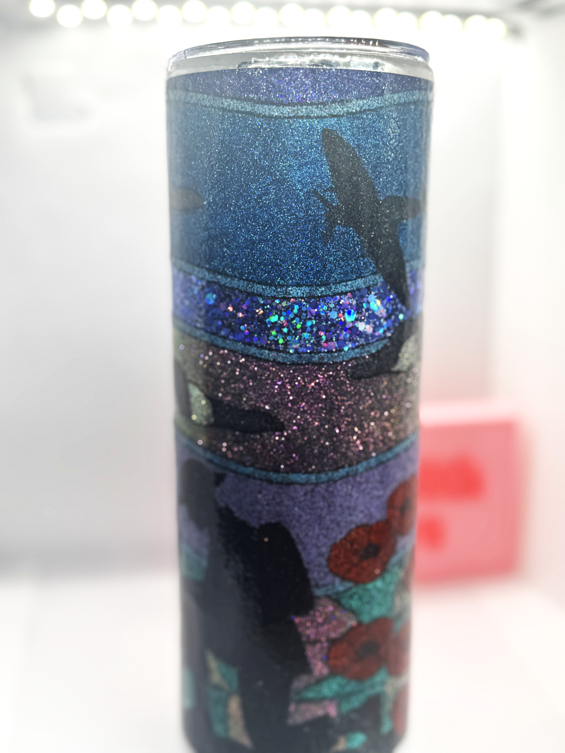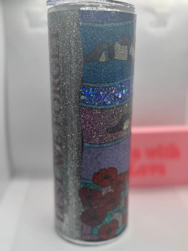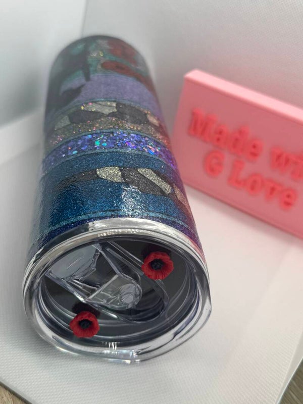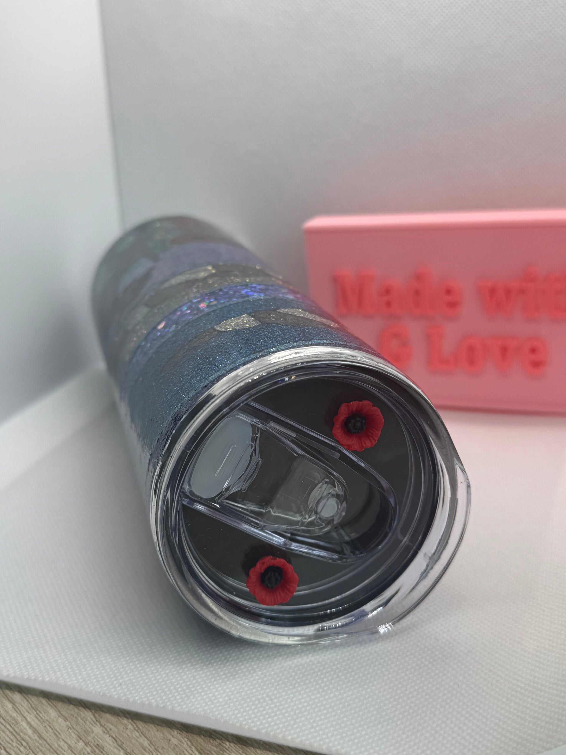 This stunning glitter tumbler is a one-of-a-kind tumbler. This 'Lest We Forget' tumbler has been handmade using various glitters and features additional poppy charms on the lid to complete it.