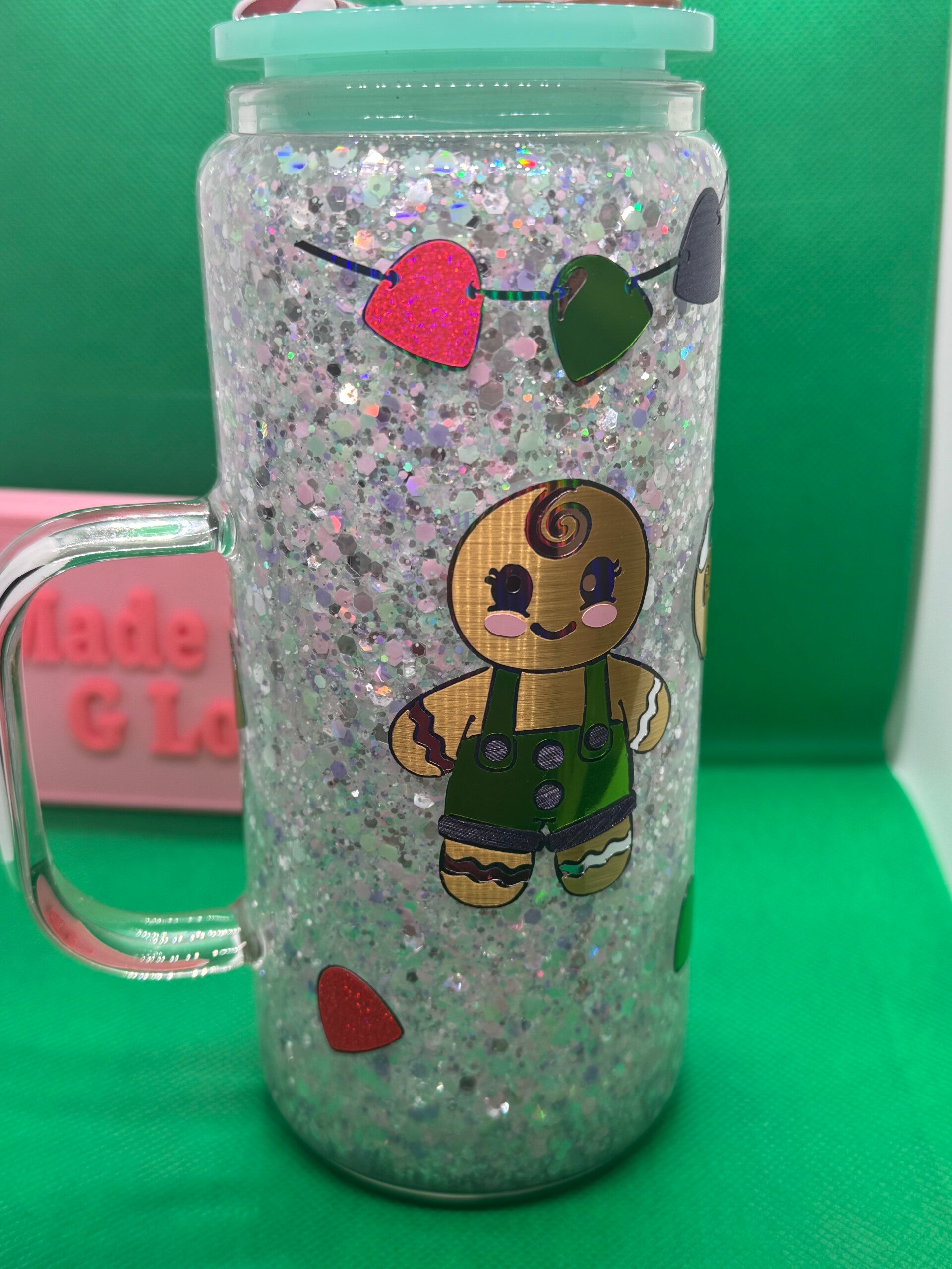 A stunning glitter filled Christmas glass cup with a decorative lid. This snowglobe is filled with glitter, which is suspended, for you to enjoy the beautiful colour and glow. This is a 16oz glass cup with a handle.