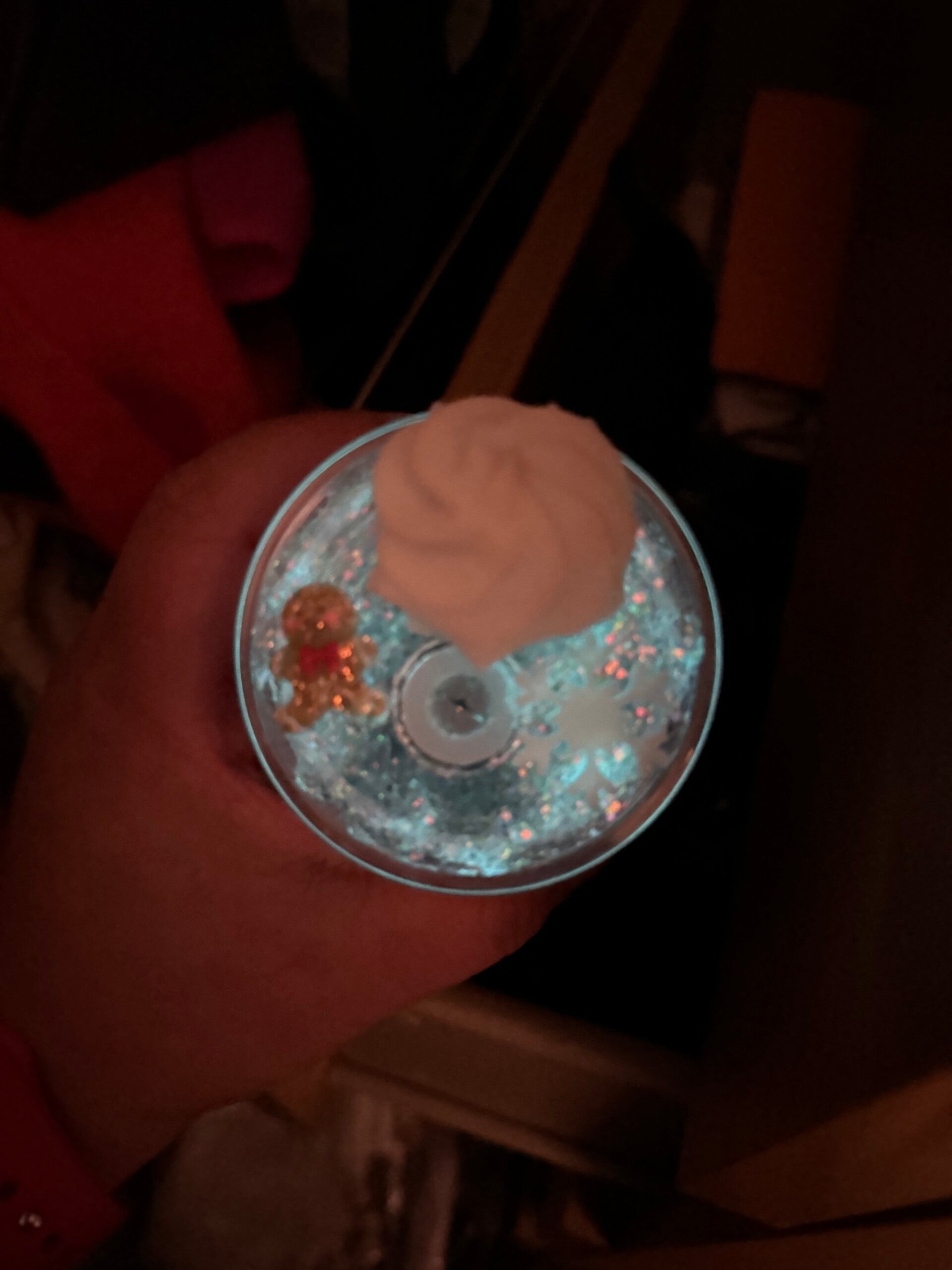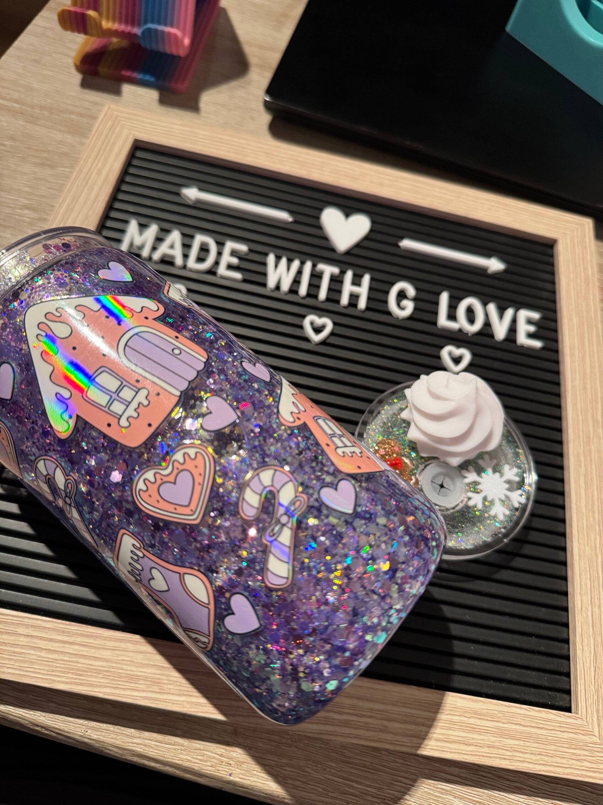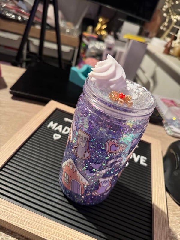 A festive gingerbread house glitters acrylic cup. It comes with a fantastic decorative lid with glow in the dark glitter - glowing like snowflakes.