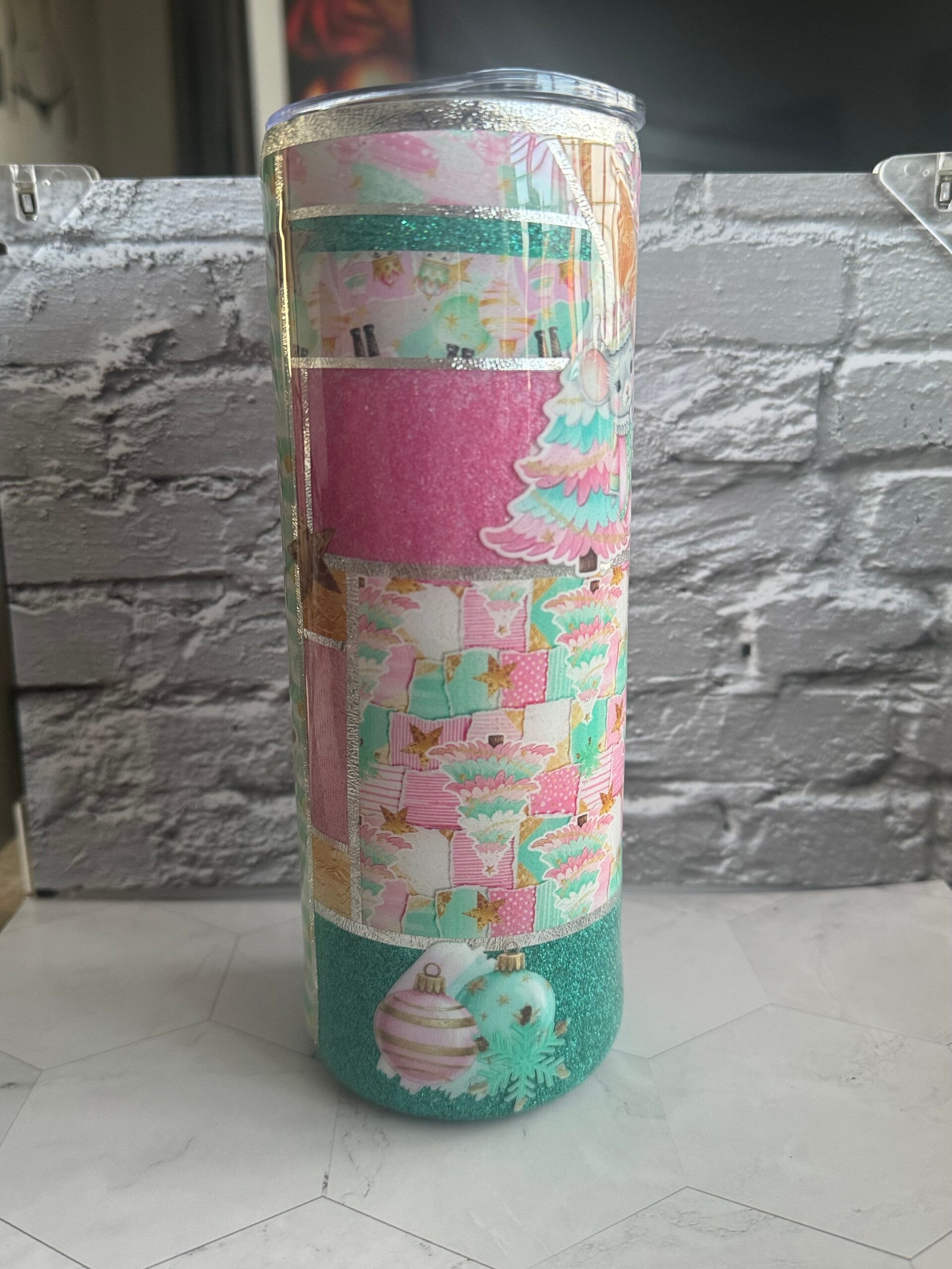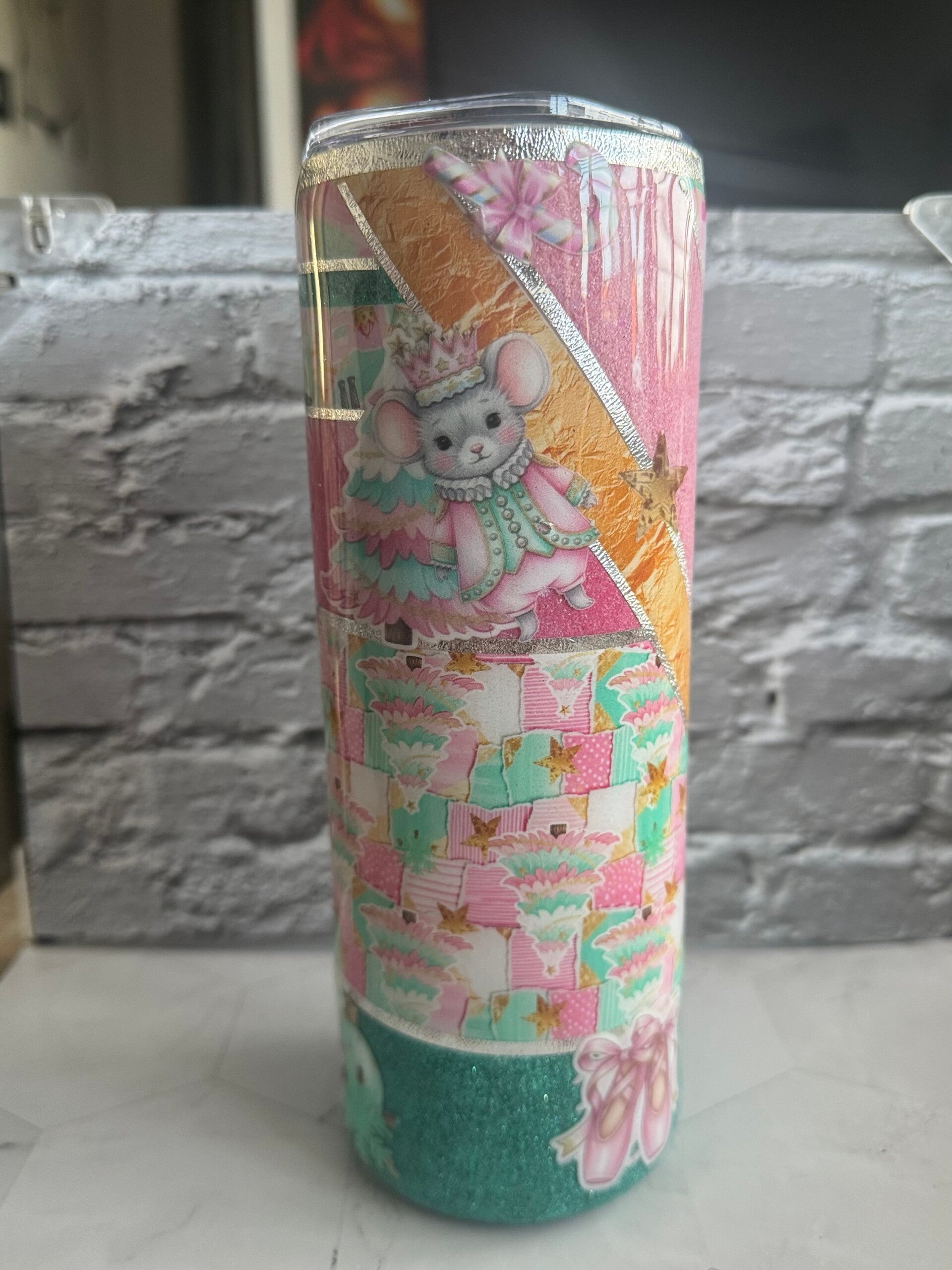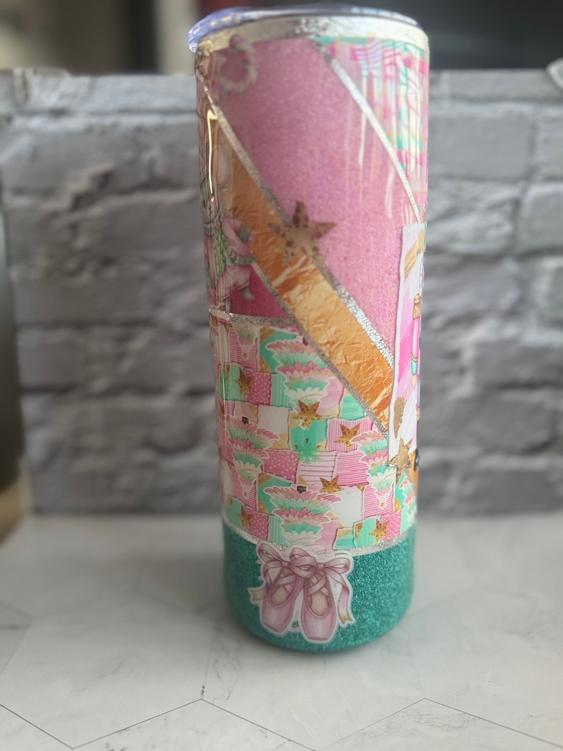 The pink Nutcracker has landed. This cup has been handmade using glitter, printed vinyl and other media patterns and a gloss finish using resin.
