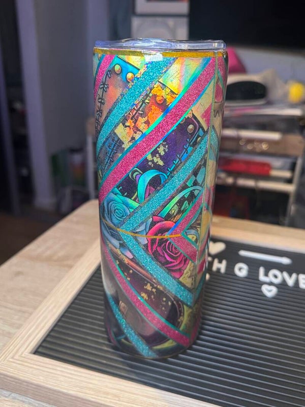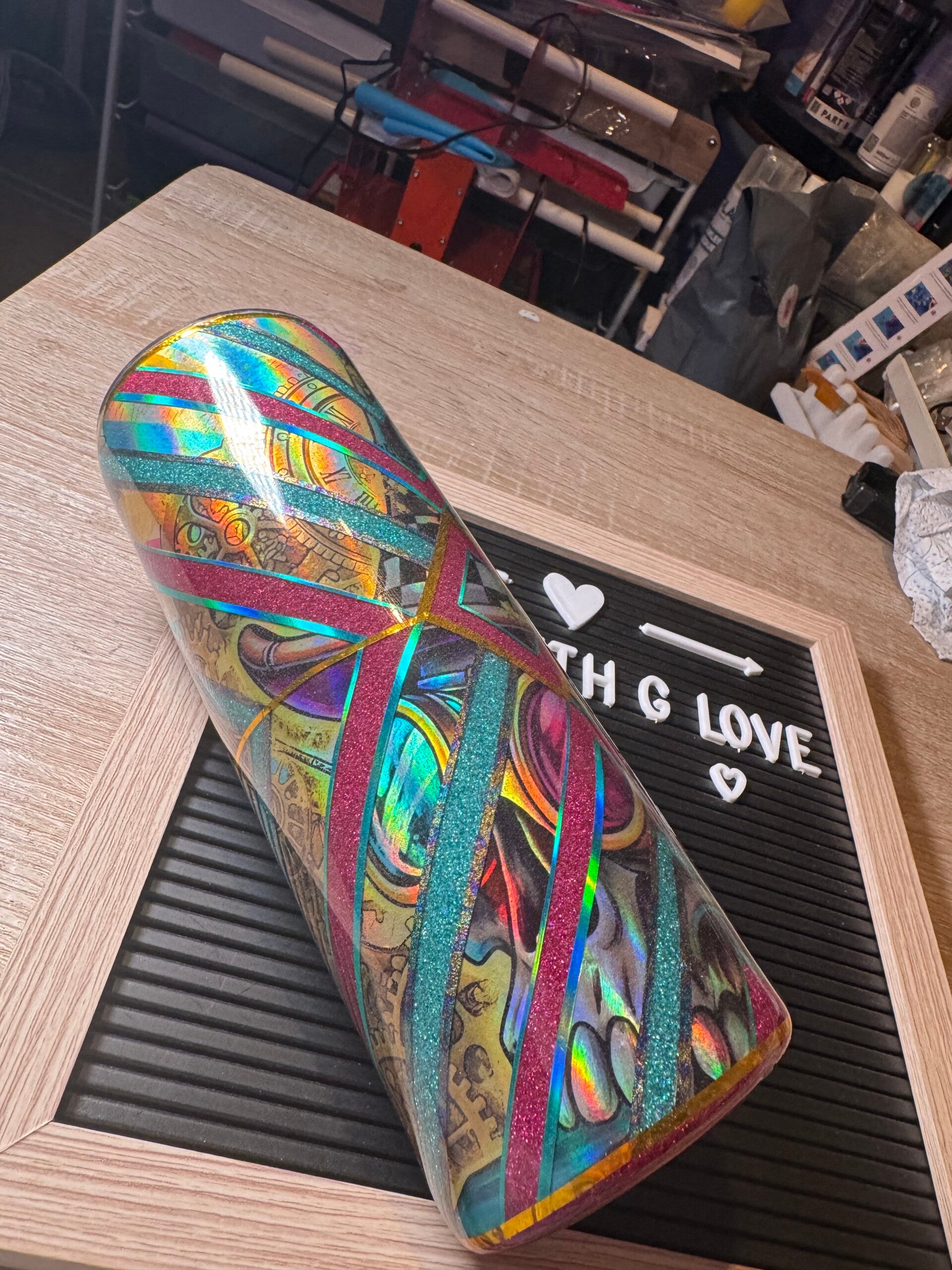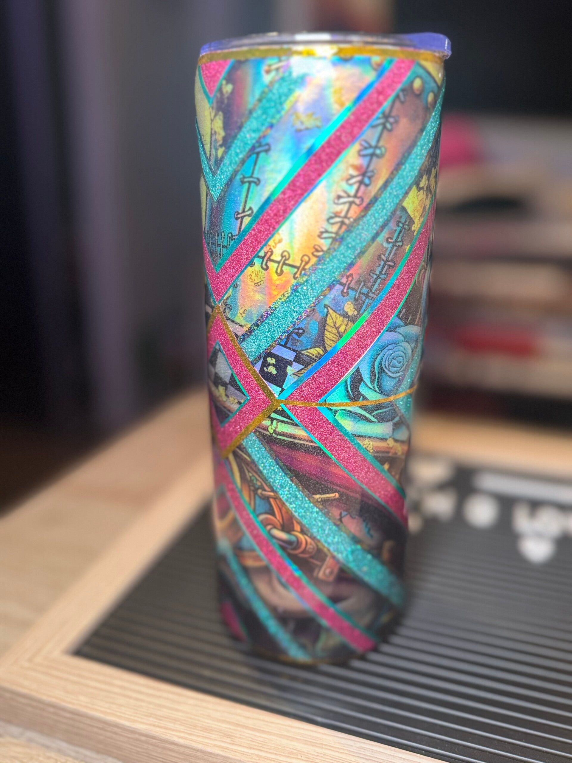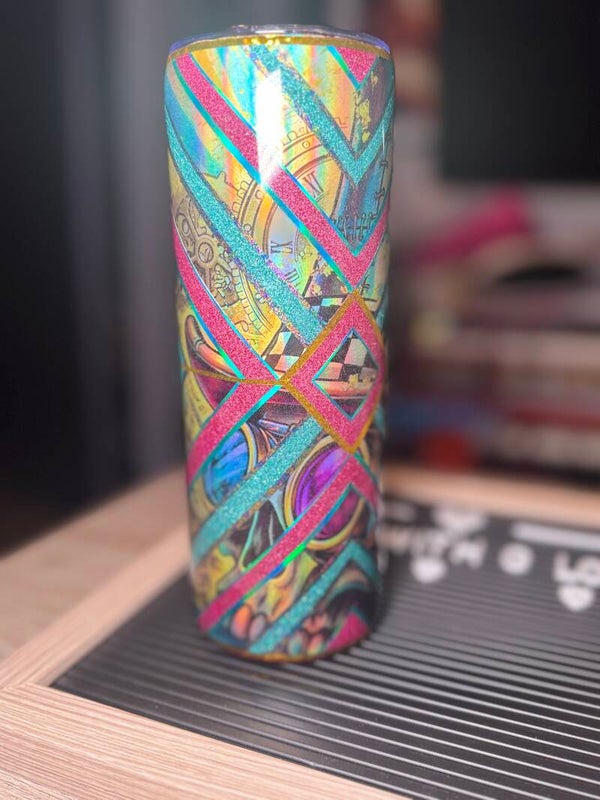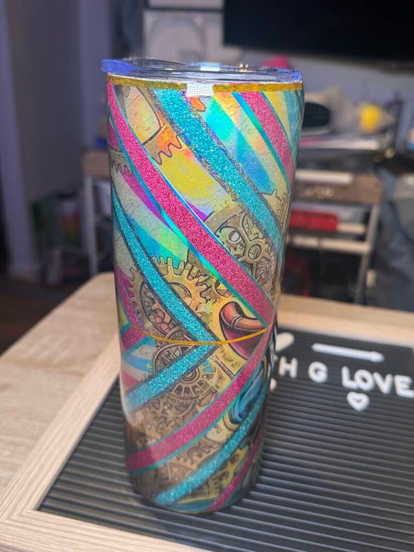 This cup has a stunning image of Stan the steampunk skull, intersected with a diamond shaped glitter pattern.
