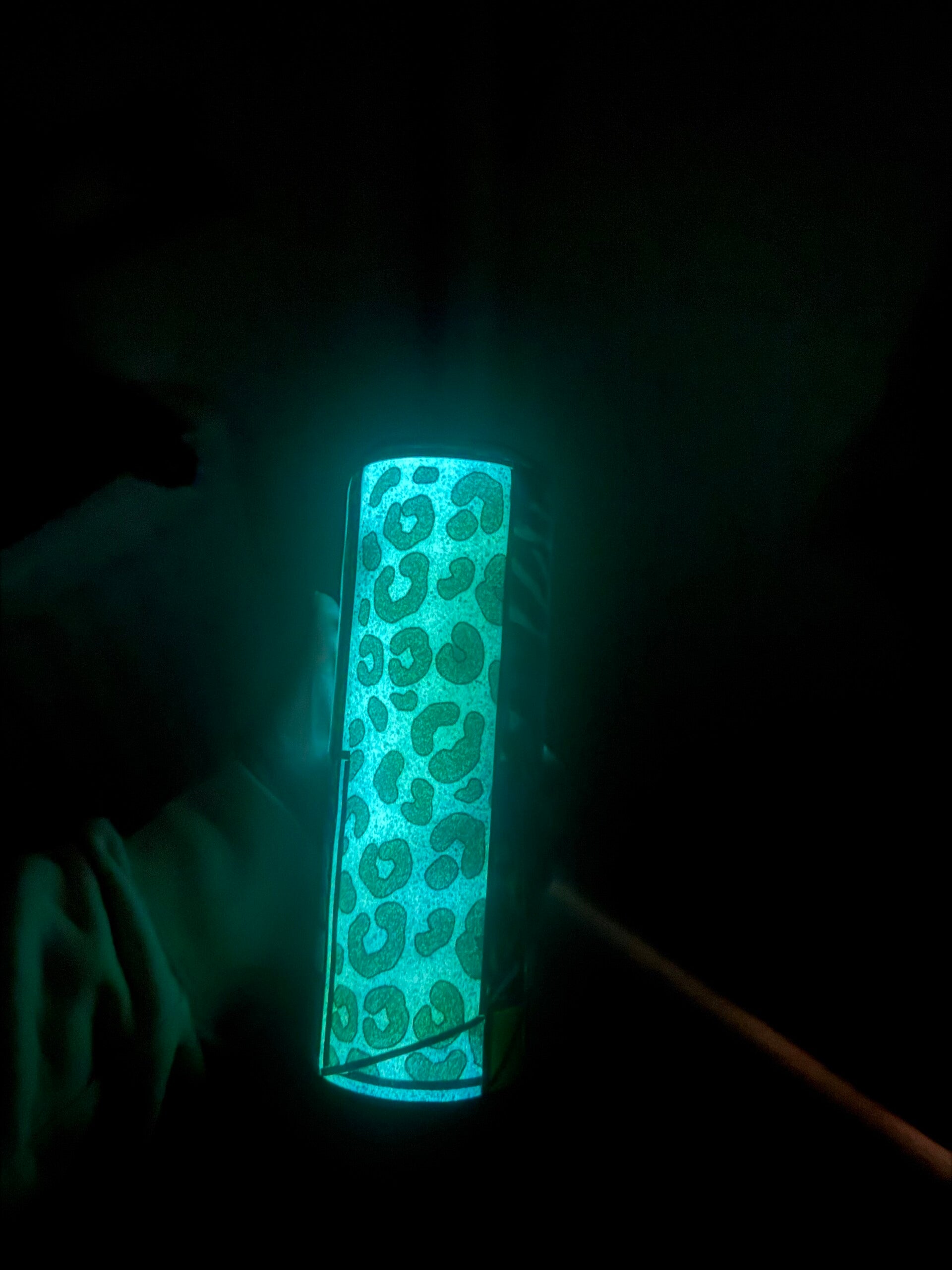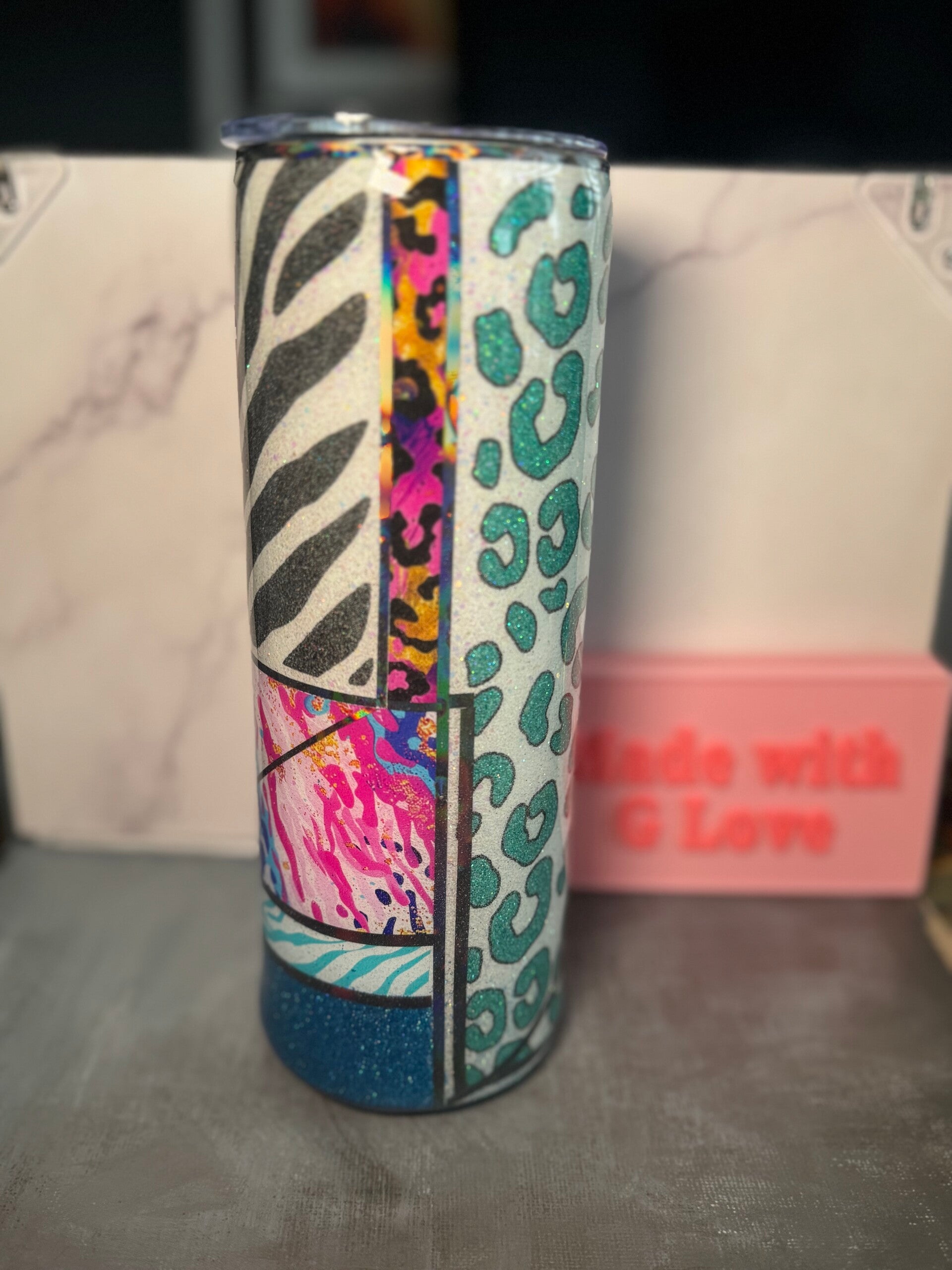 This cup has various animal prints and glitter. This cup is funky and lots of fun - because who said your drinking vessel needs to be boring! Some of the glitter even glows in the dark. This glitter cup has been handmade using various glitters and a gloss finish using resin.