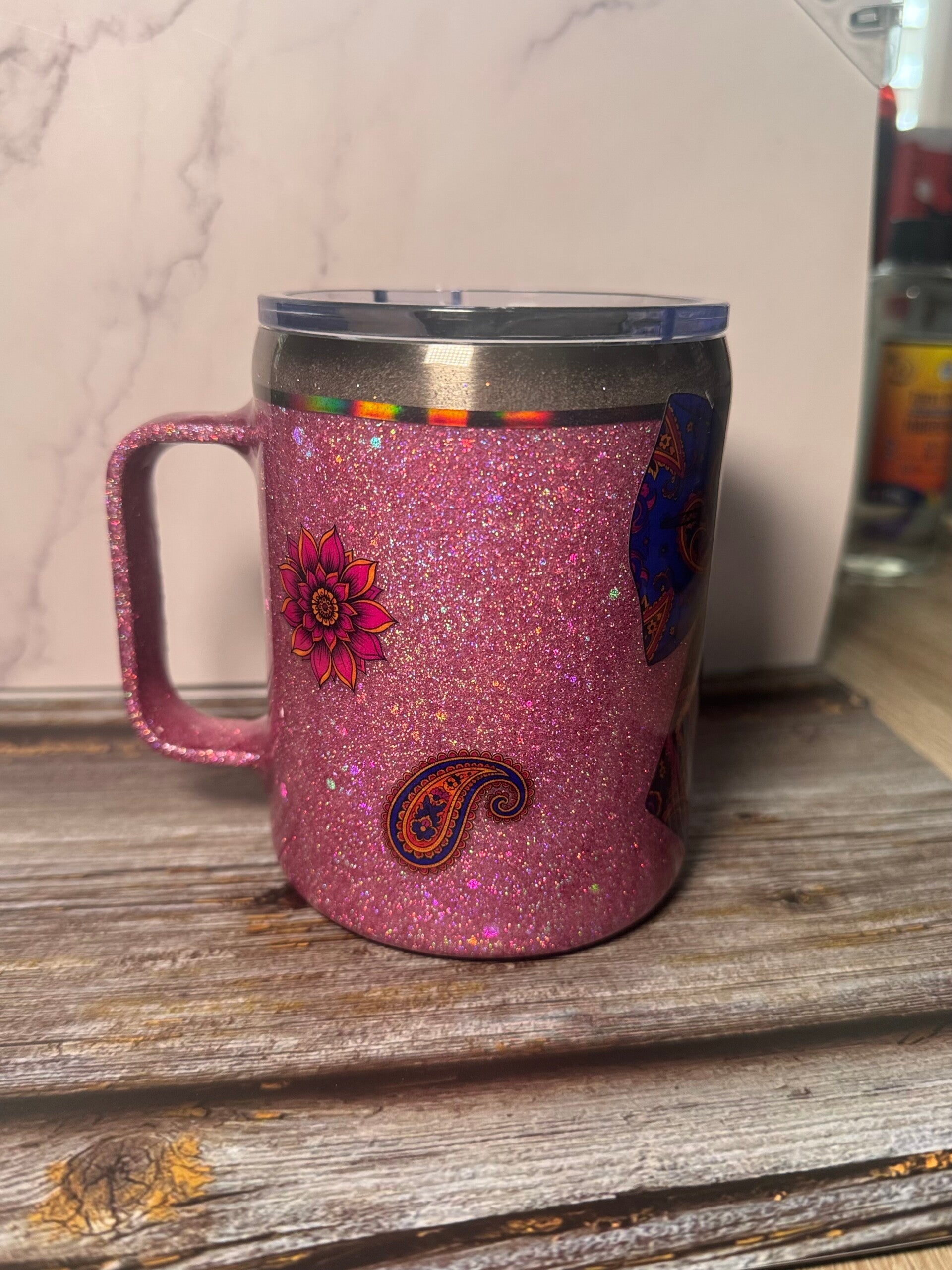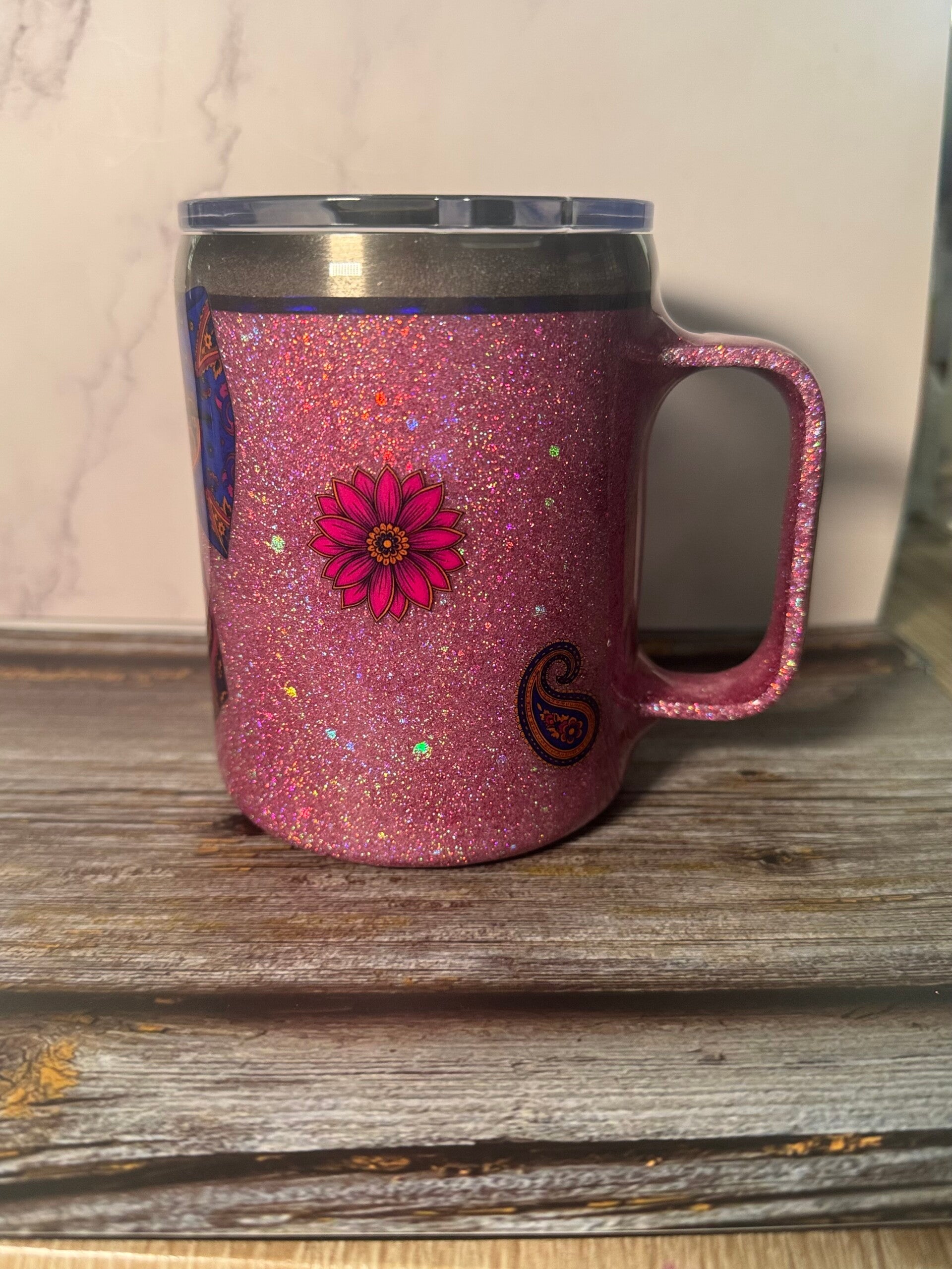 This stunning glitter cup is a one-of-a-kind tumbler. This glitter cup has been handmade using various glitters and a gloss finish using resin.