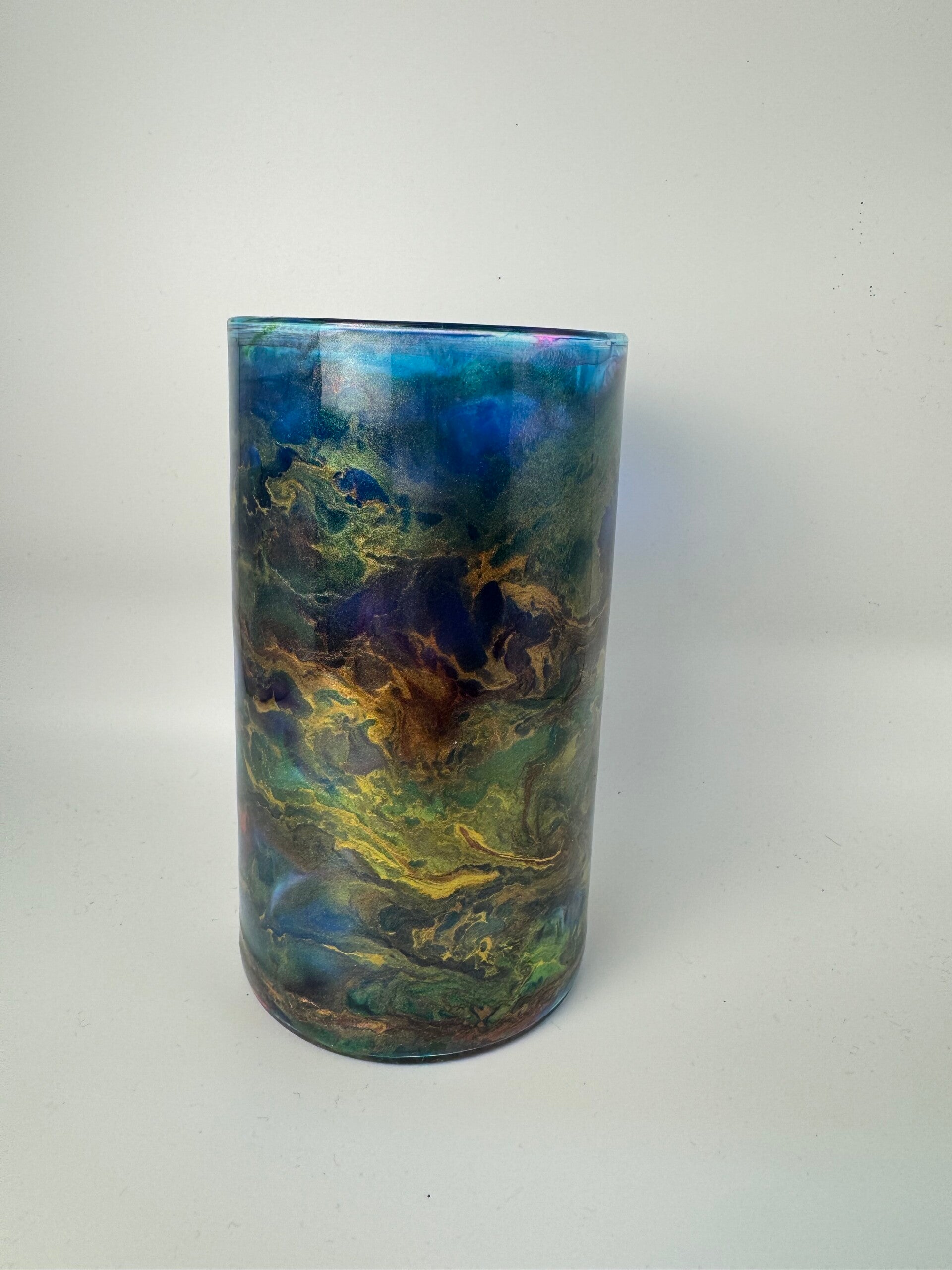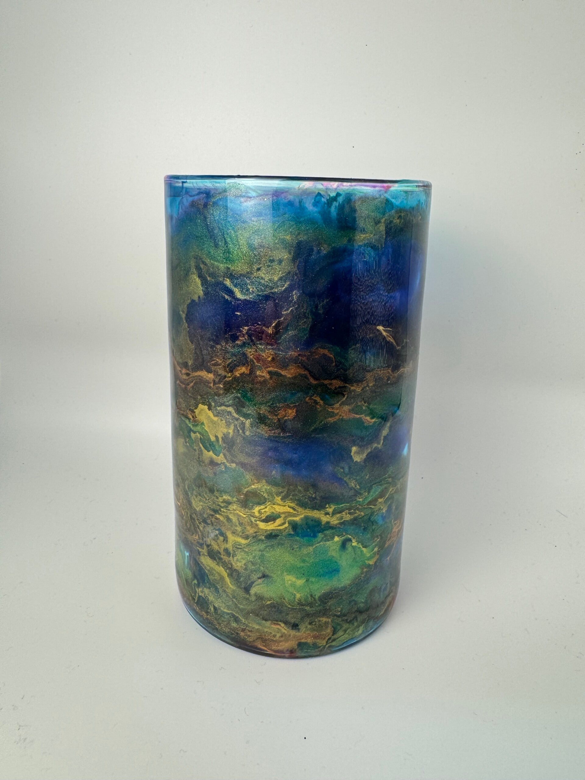 This is a glass base vase decorated with resin and ink drops.