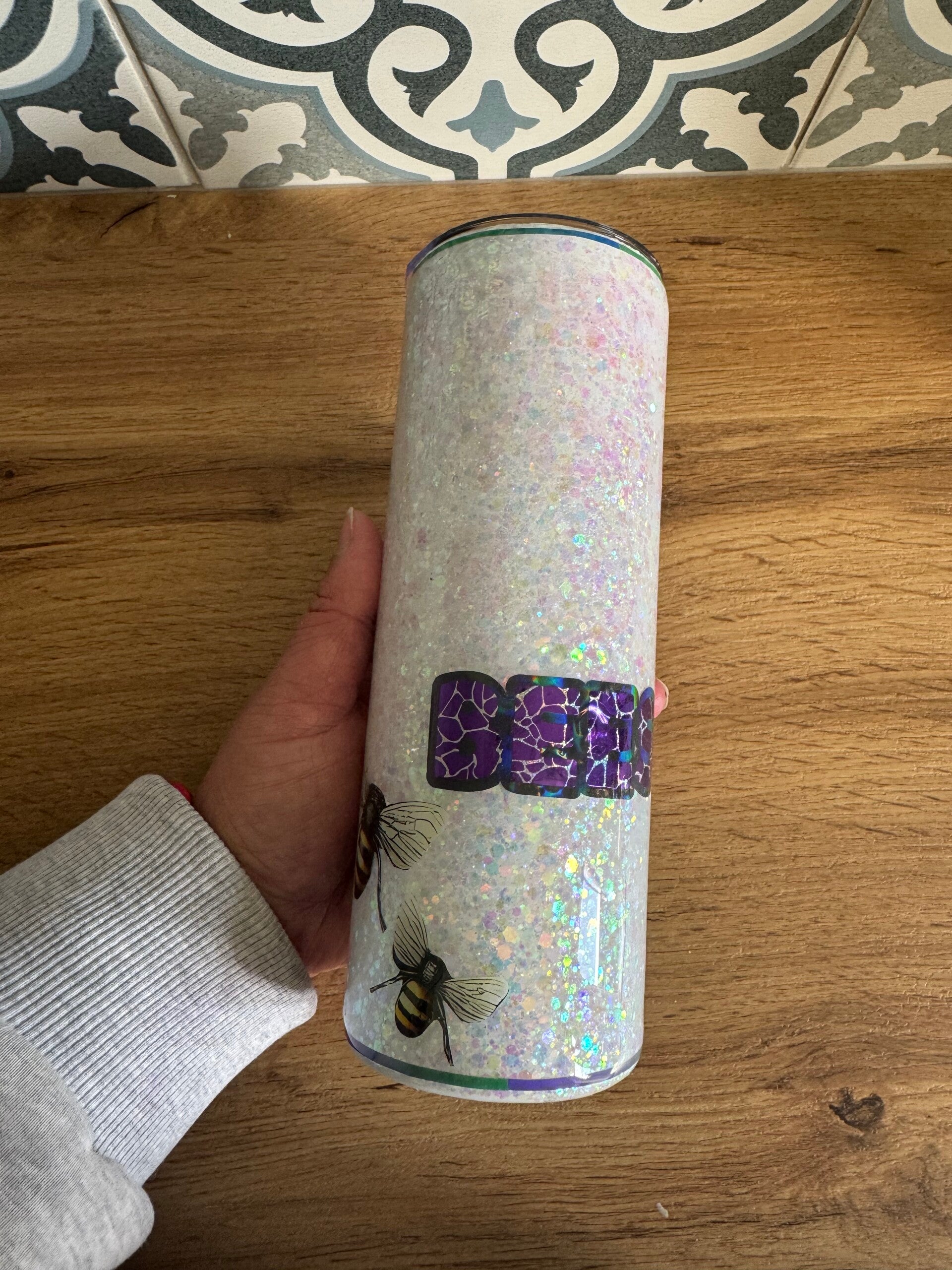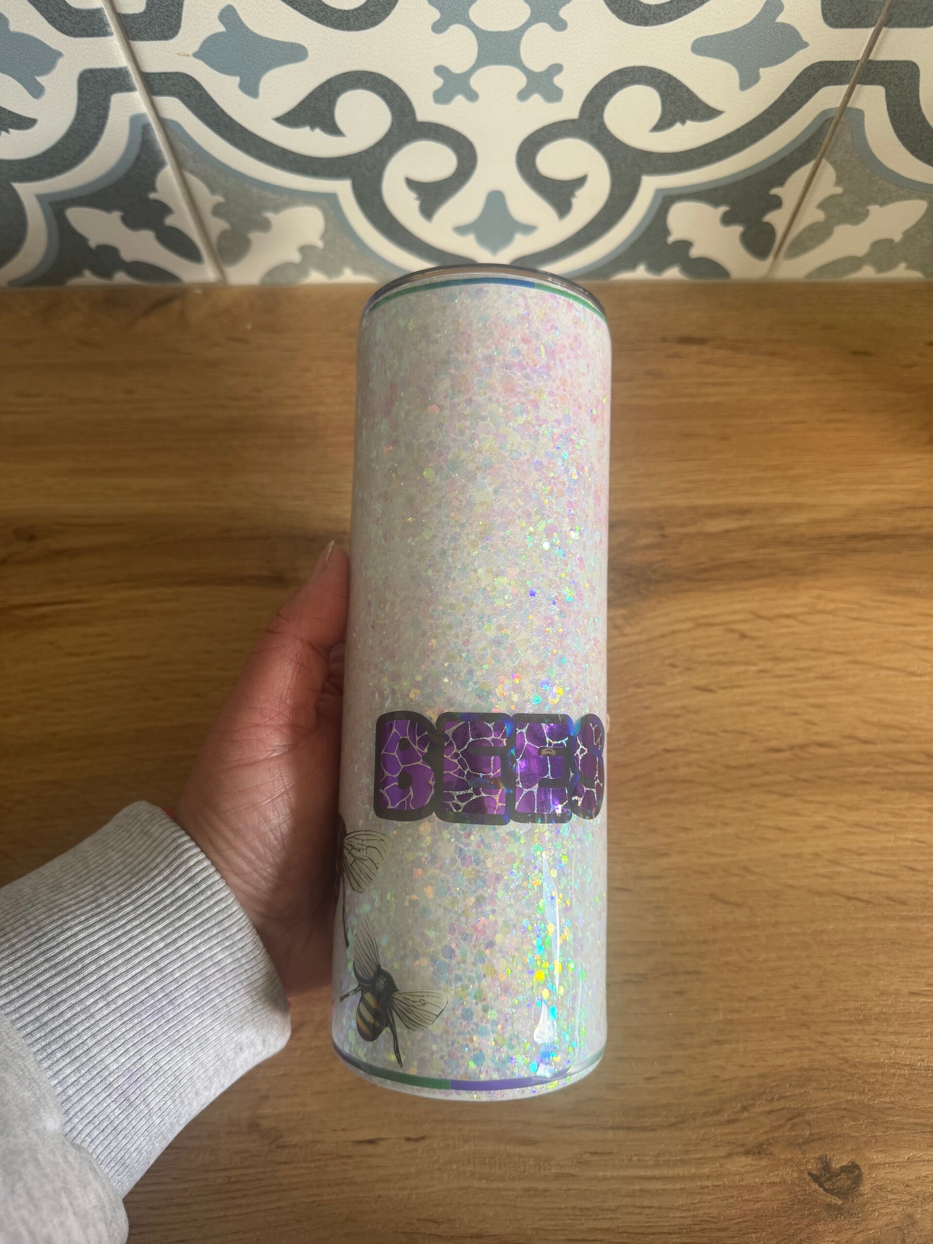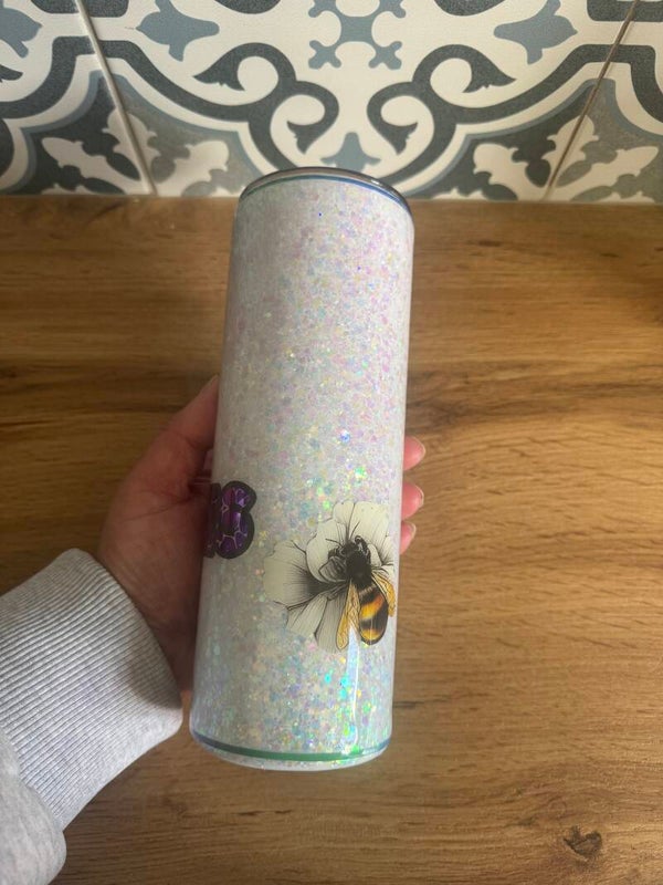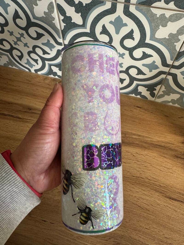 Sparkling, fun and with an important message - check your boo-bees. This stunning glitter cup is a one-of-a-kind tumbler. This glitter cup has been handmade using various glitters and a gloss finish using resin.