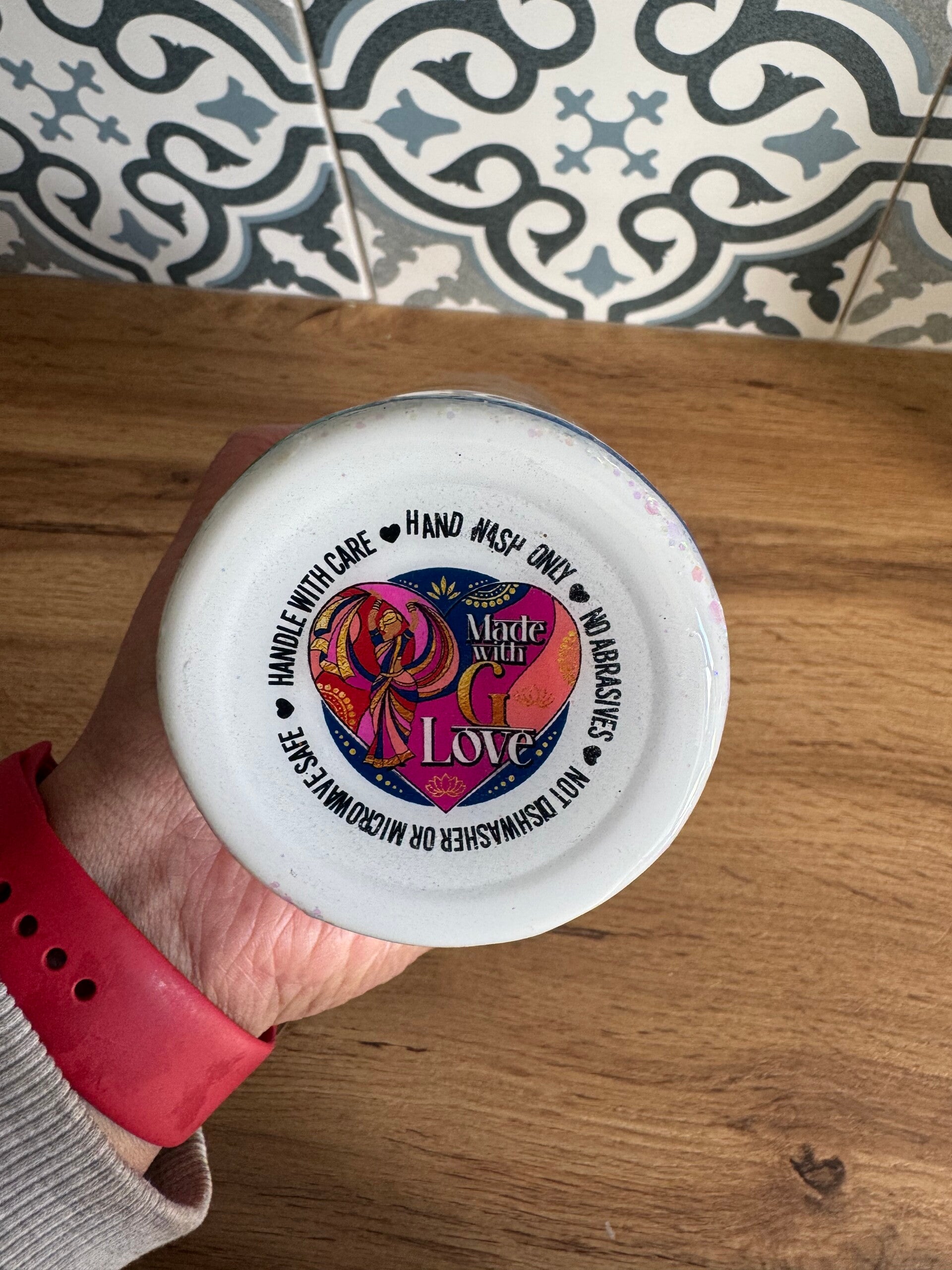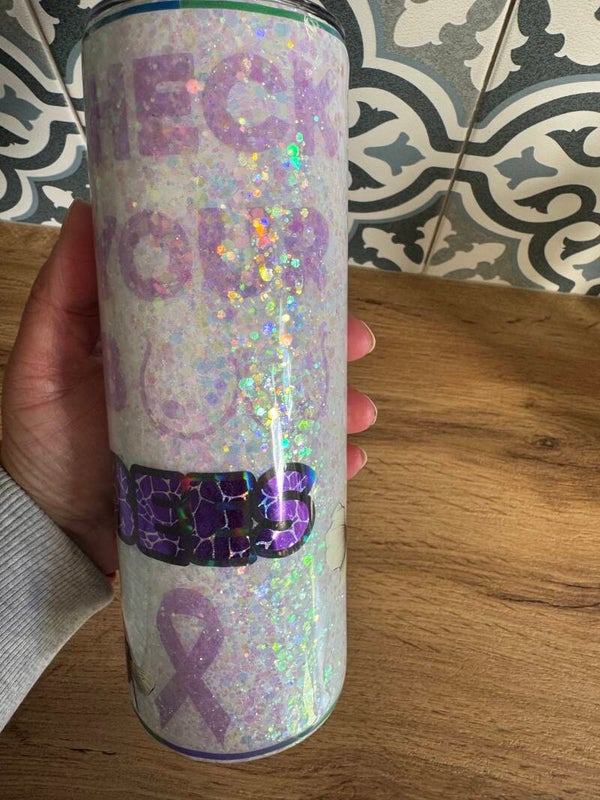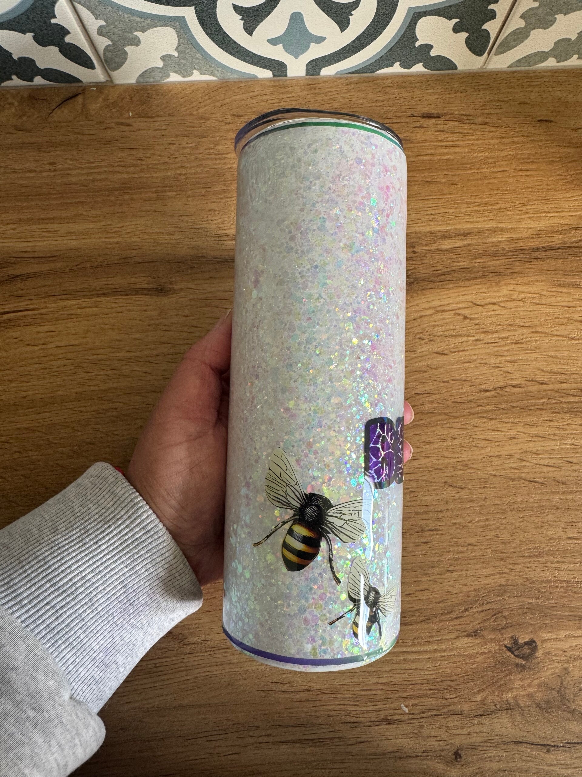 Sparkling, fun and with an important message - check your boo-bees. This stunning glitter cup is a one-of-a-kind tumbler. This glitter cup has been handmade using various glitters and a gloss finish using resin.