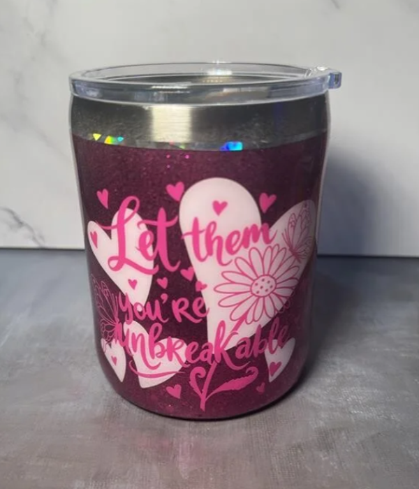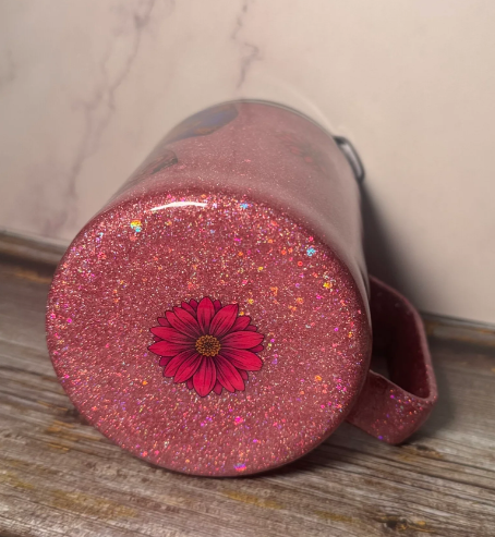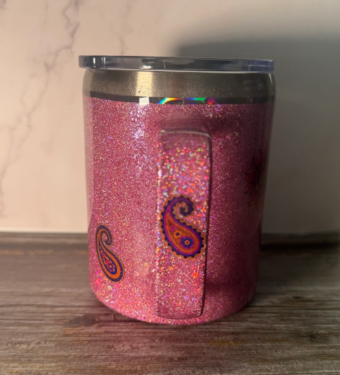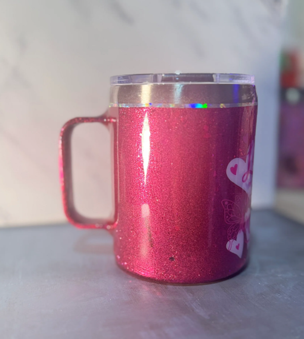 Travel mugs perfect for a hot or cold drink on the go. Handmade using various glitters and a gloss finish using resin.